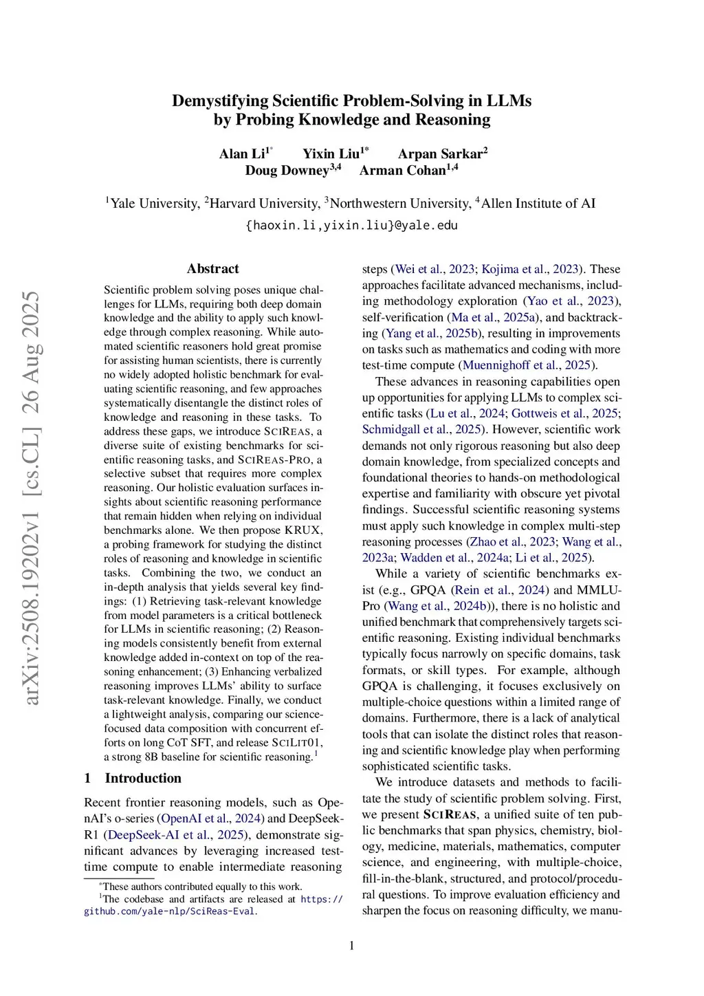 Scientific problem solving poses unique challenges for LLMs, requiring both deep domain knowledge and the ability to apply such knowledge through complex reasoning. While automated scientific reasoners hold great promise for assisting human scientists, there is currently no widely adopted holistic benchmark for evaluating scientific reasoning, and few approaches systematically disentangle the distinct roles of knowledge and reasoning in these tasks. To address these gaps, we introduce SciReas, a diverse suite of existing benchmarks for scientific reasoning tasks, and SciReas-Pro, a selective subset that requires more complex reasoning. Our holistic evaluation surfaces insights about scientific reasoning performance that remain hidden when relying on individual benchmarks alone. We then propose KRUX, a probing framework for studying the distinct roles of reasoning and knowledge in scientific tasks. Combining the two, we conduct an in-depth analysis that yields several key findings: (1) Retrieving task-relevant knowledge from model parameters is a critical bottleneck for LLMs in scientific reasoning; (2) Reasoning models consistently benefit from external knowledge added in-context on top of the reasoning enhancement; (3) Enhancing verbalized reasoning improves LLMs' ability to surface task-relevant knowledge. Finally, we conduct a lightweight analysis, comparing our science-focused data composition with concurrent efforts on long CoT SFT, and release SciLit01, a strong 8B baseline for scientific reasoning.