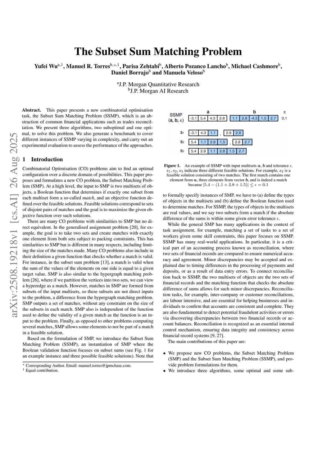 This paper presents a new combinatorial optimisation task, the Subset Sum Matching Problem (SSMP), which is an abstraction of common financial applications such as trades reconciliation. We present three algorithms, two suboptimal and one optimal, to solve this problem. We also generate a benchmark to cover different instances of SSMP varying in complexity, and carry out an experimental evaluation to assess the performance of the approaches.