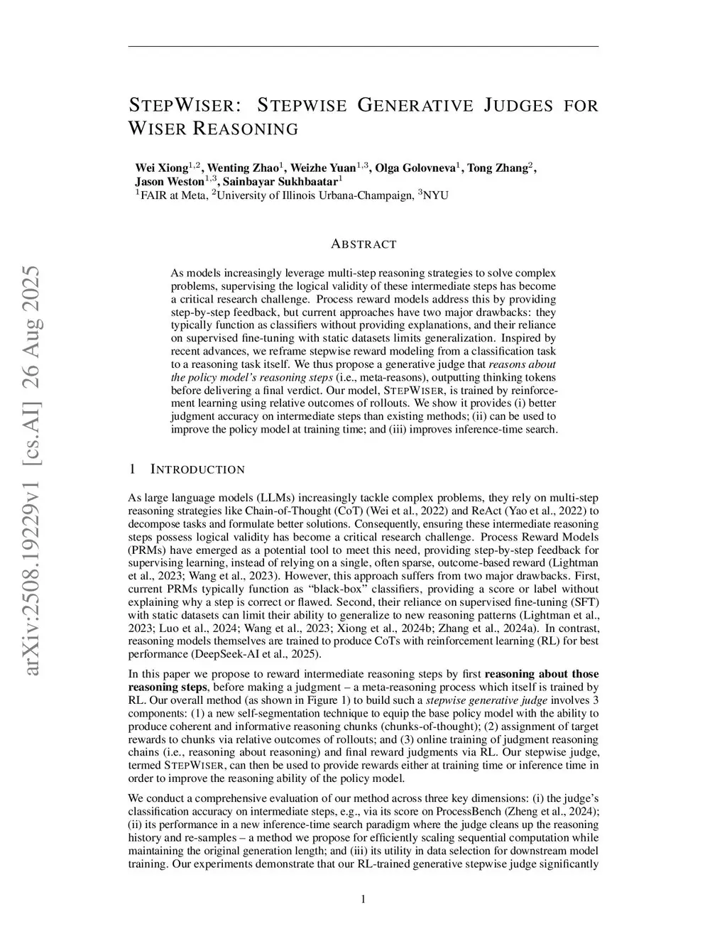 As models increasingly leverage multi-step reasoning strategies to solve complex problems, supervising the logical validity of these intermediate steps has become a critical research challenge. Process reward models address this by providing step-by-step feedback, but current approaches have two major drawbacks: they typically function as classifiers without providing explanations, and their reliance on supervised fine-tuning with static datasets limits generalization. Inspired by recent advances, we reframe stepwise reward modeling from a classification task to a reasoning task itself. We thus propose a generative judge that reasons about the policy model's reasoning steps (i.e., meta-reasons), outputting thinking tokens before delivering a final verdict. Our model, StepWiser, is trained by reinforcement learning using relative outcomes of rollouts. We show it provides (i) better judgment accuracy on intermediate steps than existing methods; (ii) can be used to improve the policy model at training time; and (iii) improves inference-time search.