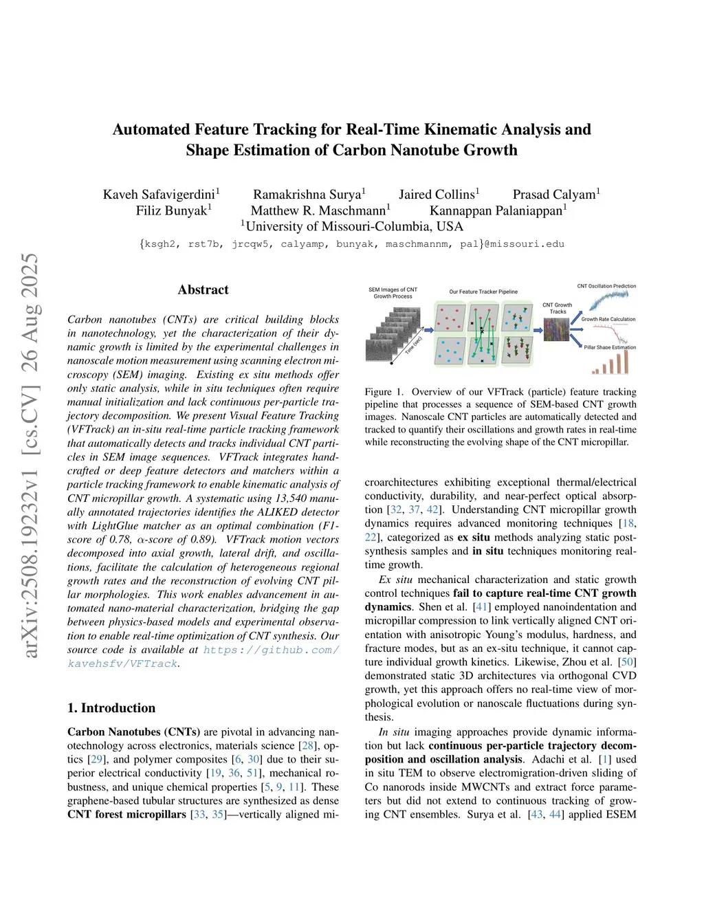 Carbon nanotubes (CNTs) are critical building blocks in nanotechnology, yet the characterization of their dynamic growth is limited by the experimental challenges in nanoscale motion measurement using scanning electron microscopy (SEM) imaging. Existing ex situ methods offer only static analysis, while in situ techniques often require manual initialization and lack continuous per-particle trajectory decomposition. We present Visual Feature Tracking (VFTrack) an in-situ real-time particle tracking framework that automatically detects and tracks individual CNT particles in SEM image sequences. VFTrack integrates handcrafted or deep feature detectors and matchers within a particle tracking framework to enable kinematic analysis of CNT micropillar growth. A systematic using 13,540 manually annotated trajectories identifies the ALIKED detector with LightGlue matcher as an optimal combination (F1-score of 0.78, -score of 0.89). VFTrack motion vectors decomposed into axial growth, lateral drift, and oscillations, facilitate the calculation of heterogeneous regional growth rates and the reconstruction of evolving CNT pillar morphologies. This work enables advancement in automated nano-material characterization, bridging the gap between physics-based models and experimental observation to enable real-time optimization of CNT synthesis.
