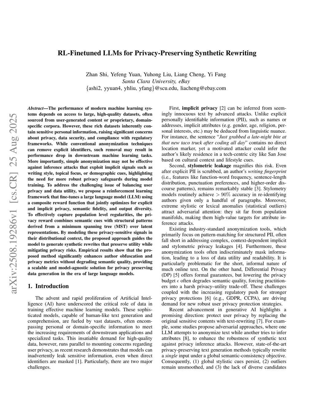 The performance of modern machine learning systems depends on access to large, high-quality datasets, often sourced from user-generated content or proprietary, domain-specific corpora. However, these rich datasets inherently contain sensitive personal information, raising significant concerns about privacy, data security, and compliance with regulatory frameworks. While conventional anonymization techniques can remove explicit identifiers, such removal may result in performance drop in downstream machine learning tasks. More importantly, simple anonymization may not be effective against inference attacks that exploit implicit signals such as writing style, topical focus, or demographic cues, highlighting the need for more robust privacy safeguards during model training. To address the challenging issue of balancing user privacy and data utility, we propose a reinforcement learning framework that fine-tunes a large language model (LLM) using a composite reward function that jointly optimizes for explicit and implicit privacy, semantic fidelity, and output diversity. To effectively capture population level regularities, the privacy reward combines semantic cues with structural patterns derived from a minimum spanning tree (MST) over latent representations. By modeling these privacy-sensitive signals in their distributional context, the proposed approach guides the model to generate synthetic rewrites that preserve utility while mitigating privacy risks. Empirical results show that the proposed method significantly enhances author obfuscation and privacy metrics without degrading semantic quality, providing a scalable and model-agnostic solution for privacy preserving data generation in the era of large language models.