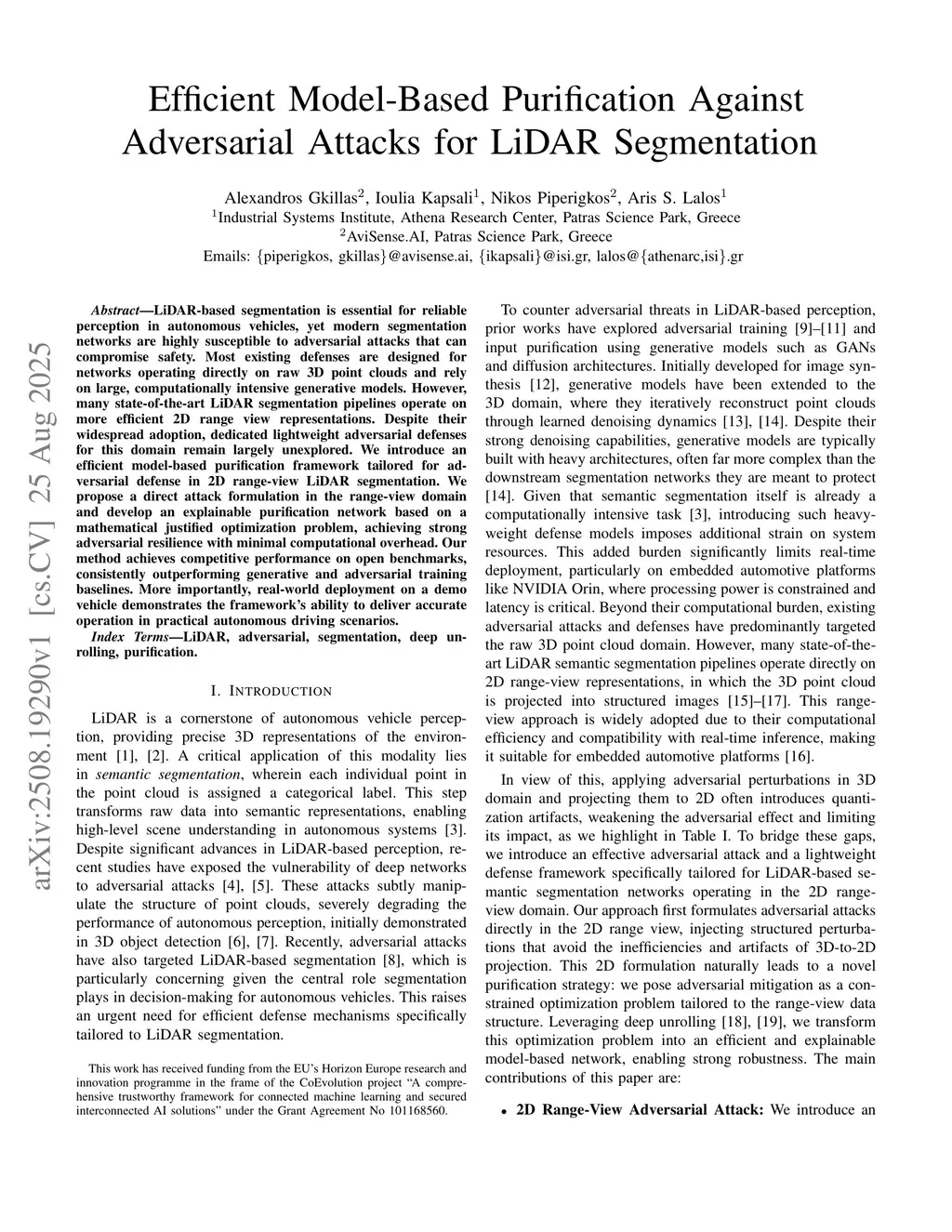 LiDAR-based segmentation is essential for reliable perception in autonomous vehicles, yet modern segmentation networks are highly susceptible to adversarial attacks that can compromise safety. Most existing defenses are designed for networks operating directly on raw 3D point clouds and rely on large, computationally intensive generative models. However, many state-of-the-art LiDAR segmentation pipelines operate on more efficient 2D range view representations. Despite their widespread adoption, dedicated lightweight adversarial defenses for this domain remain largely unexplored. We introduce an efficient model-based purification framework tailored for adversarial defense in 2D range-view LiDAR segmentation. We propose a direct attack formulation in the range-view domain and develop an explainable purification network based on a mathematical justified optimization problem, achieving strong adversarial resilience with minimal computational overhead. Our method achieves competitive performance on open benchmarks, consistently outperforming generative and adversarial training baselines. More importantly, real-world deployment on a demo vehicle demonstrates the framework's ability to deliver accurate operation in practical autonomous driving scenarios.