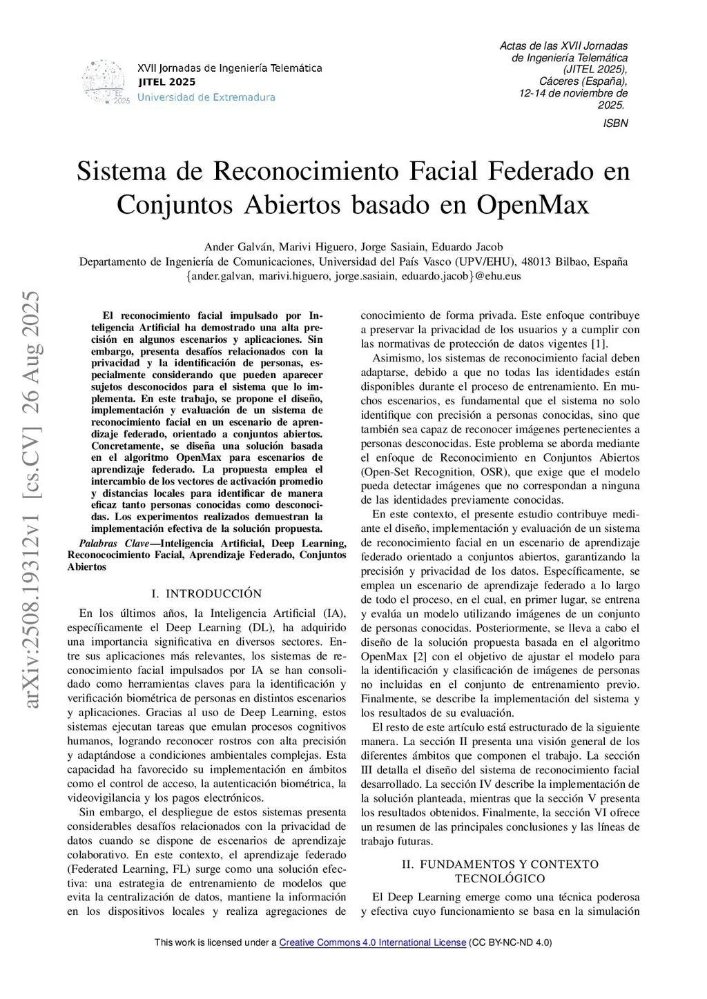 Facial recognition powered by Artificial Intelligence has achieved high accuracy in specific scenarios and applications. Nevertheless, it faces significant challenges regarding privacy and identity management, particularly when unknown individuals appear in the operational context. This paper presents the design, implementation, and evaluation of a facial recognition system within a federated learning framework tailored to open-set scenarios. The proposed approach integrates the OpenMax algorithm into federated learning, leveraging the exchange of mean activation vectors and local distance measures to reliably distinguish between known and unknown subjects. Experimental results validate the effectiveness of the proposed solution, demonstrating its potential for enhancing privacy-aware and robust facial recognition in distributed environments.--El reconocimiento facial impulsado por Inteligencia Artificial ha demostrado una alta precisión en algunos escenarios y aplicaciones. Sin embargo, presenta desafíos relacionados con la privacidad y la identificación de personas, especialmente considerando que pueden aparecer sujetos desconocidos para el sistema que lo implementa. En este trabajo, se propone el diseño, implementación y evaluación de un sistema de reconocimiento facial en un escenario de aprendizaje federado, orientado a conjuntos abiertos. Concretamente, se diseña una solución basada en el algoritmo OpenMax para escenarios de aprendizaje federado. La propuesta emplea el intercambio de los vectores de activación promedio y distancias locales para identificar de manera eficaz tanto personas conocidas como desconocidas. Los experimentos realizados demuestran la implementación efectiva de la solución propuesta.