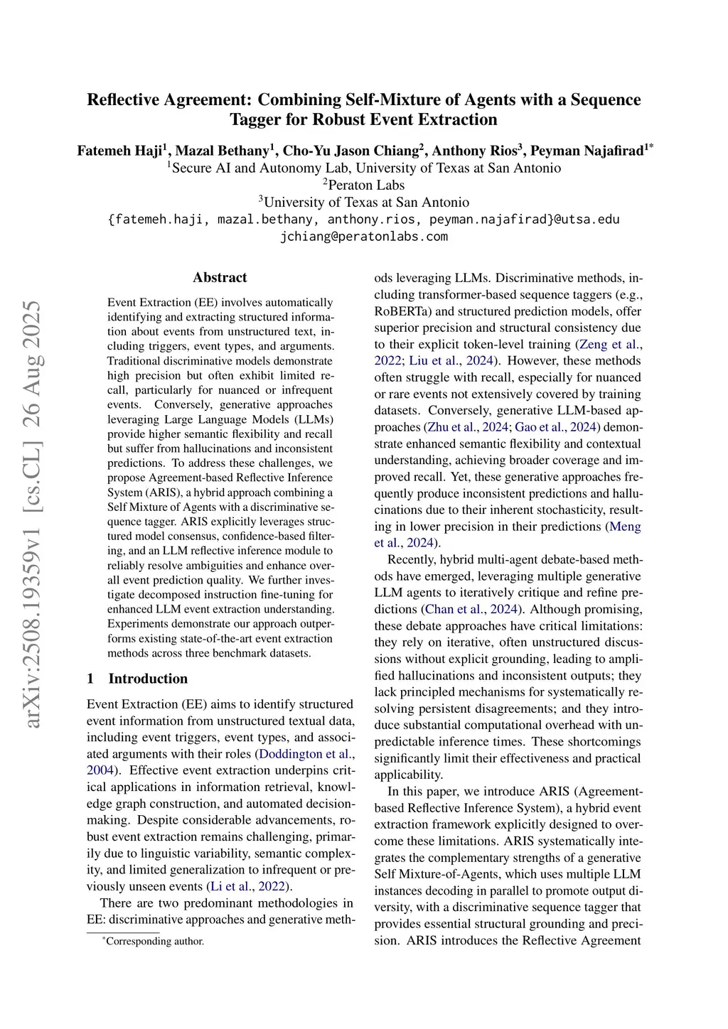 Event Extraction (EE) involves automatically identifying and extracting structured information about events from unstructured text, including triggers, event types, and arguments. Traditional discriminative models demonstrate high precision but often exhibit limited recall, particularly for nuanced or infrequent events. Conversely, generative approaches leveraging Large Language Models (LLMs) provide higher semantic flexibility and recall but suffer from hallucinations and inconsistent predictions. To address these challenges, we propose Agreement-based Reflective Inference System (ARIS), a hybrid approach combining a Self Mixture of Agents with a discriminative sequence tagger. ARIS explicitly leverages structured model consensus, confidence-based filtering, and an LLM reflective inference module to reliably resolve ambiguities and enhance overall event prediction quality. We further investigate decomposed instruction fine-tuning for enhanced LLM event extraction understanding. Experiments demonstrate our approach outperforms existing state-of-the-art event extraction methods across three benchmark datasets.