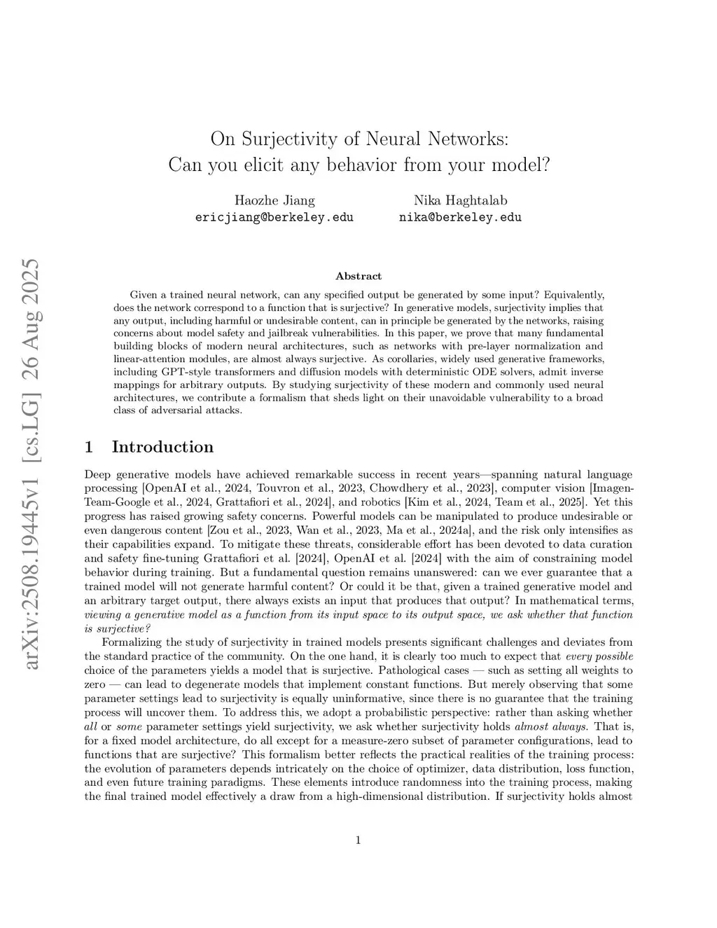 Given a trained neural network, can any specified output be generated by some input? Equivalently, does the network correspond to a function that is surjective? In generative models, surjectivity implies that any output, including harmful or undesirable content, can in principle be generated by the networks, raising concerns about model safety and jailbreak vulnerabilities. In this paper, we prove that many fundamental building blocks of modern neural architectures, such as networks with pre-layer normalization and linear-attention modules, are almost always surjective. As corollaries, widely used generative frameworks, including GPT-style transformers and diffusion models with deterministic ODE solvers, admit inverse mappings for arbitrary outputs. By studying surjectivity of these modern and commonly used neural architectures, we contribute a formalism that sheds light on their unavoidable vulnerability to a broad class of adversarial attacks.