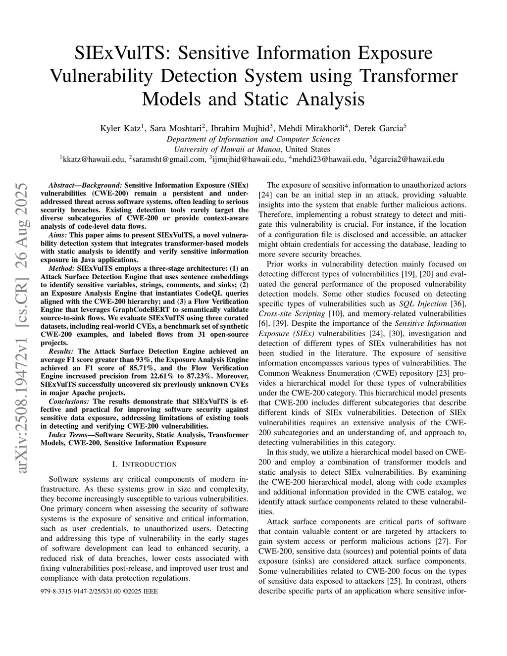 Sensitive Information Exposure (SIEx) vulnerabilities (CWE-200) remain a persistent and under-addressed threat across software systems, often leading to serious security breaches. Existing detection tools rarely target the diverse subcategories of CWE-200 or provide context-aware analysis of code-level data flows.Aims: This paper aims to present SIExVulTS, a novel vulnerability detection system that integrates transformer-based models with static analysis to identify and verify sensitive information exposure in Java applications.Method: SIExVulTS employs a three-stage architecture: (1) an Attack Surface Detection Engine that uses sentence embeddings to identify sensitive variables, strings, comments, and sinks; (2) an Exposure Analysis Engine that instantiates CodeQL queries aligned with the CWE-200 hierarchy; and (3) a Flow Verification Engine that leverages GraphCodeBERT to semantically validate source-to-sink flows. We evaluate SIExVulTS using three curated datasets, including real-world CVEs, a benchmark set of synthetic CWE-200 examples, and labeled flows from 31 open-source projects.Results: The Attack Surface Detection Engine achieved an average F1 score greater than 93\%, the Exposure Analysis Engine achieved an F1 score of 85.71\%, and the Flow Verification Engine increased precision from 22.61\% to 87.23\%. Moreover, SIExVulTS successfully uncovered six previously unknown CVEs in major Apache projects.Conclusions: The results demonstrate that SIExVulTS is effective and practical for improving software security against sensitive data exposure, addressing limitations of existing tools in detecting and verifying CWE-200 vulnerabilities.