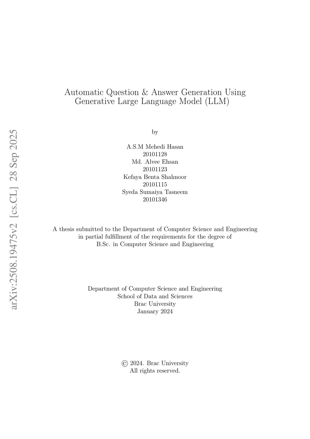 \Abstract{In the realm of education, student evaluation holds equal significance as imparting knowledge. To be evaluated, students usually need to go through text-based academic assessment methods. Instructors need to make diverse sets of questions that need to be fair for all students to prove their adequacy over a particular topic. This can prove to be quite challenging as they may need to manually go through several different lecture materials. Our objective is to make this whole process much easier by implementing Automatic Question Answer Generation /(AQAG), using fine-tuned generative LLM. For tailoring the instructor's preferred question style (MCQ, conceptual, or factual questions), prompt Engineering (PE) is being utilized. In this research, we propose to leverage unsupervised learning methods in NLP, primarily focusing on the English language. This approach empowers the base Meta-Llama 2-7B model to integrate RACE dataset as training data for the fine-tuning process. Creating a customized model that will offer efficient solutions for educators, instructors, and individuals engaged in text-based evaluations. A reliable and efficient tool for generating questions and answers can free up valuable time and resources, thus streamlining their evaluation processes.}