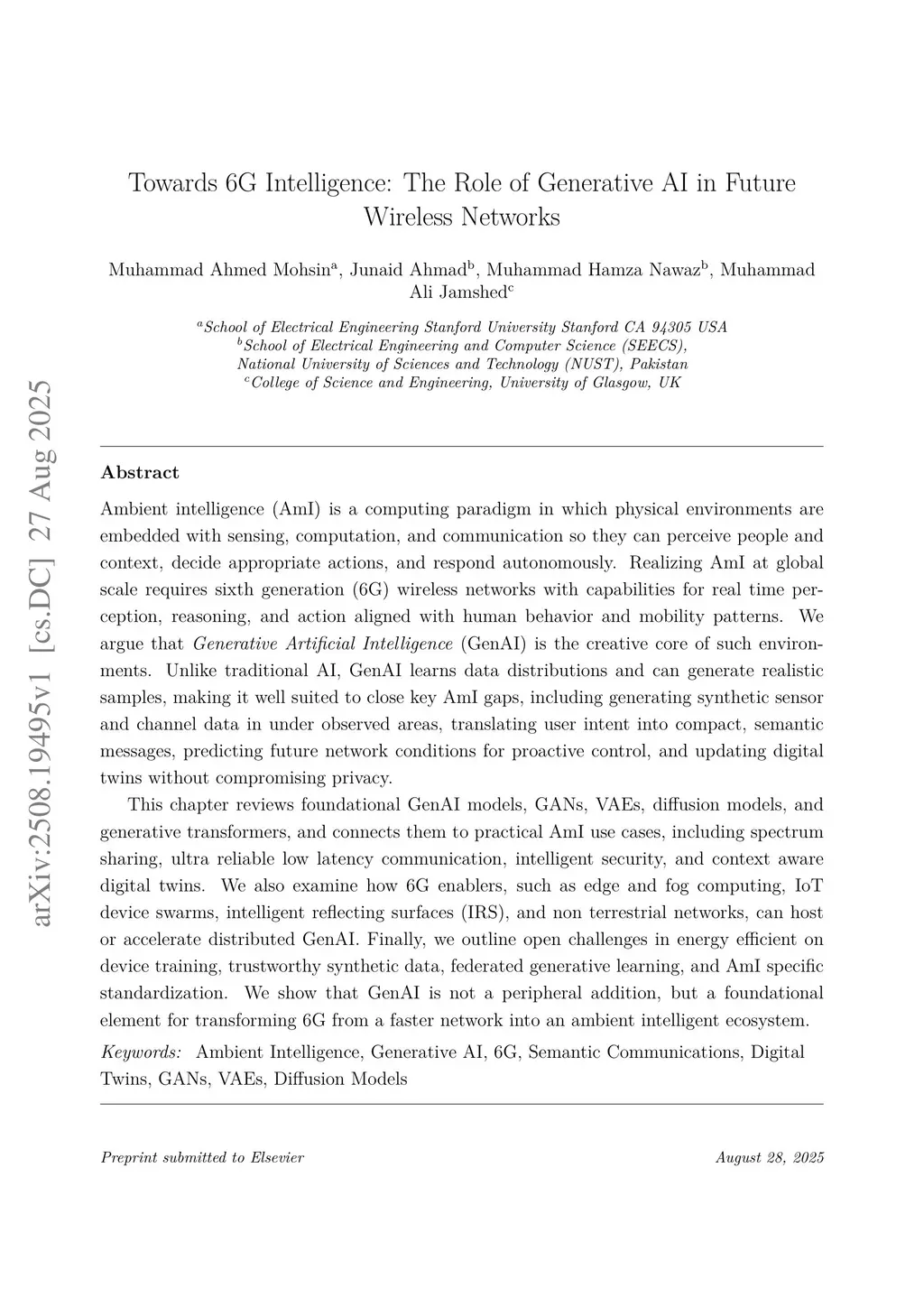 Ambient intelligence (AmI) is a computing paradigm in which physical environments are embedded with sensing, computation, and communication so they can perceive people and context, decide appropriate actions, and respond autonomously. Realizing AmI at global scale requires sixth generation (6G) wireless networks with capabilities for real time perception, reasoning, and action aligned with human behavior and mobility patterns. We argue that Generative Artificial Intelligence (GenAI) is the creative core of such environments. Unlike traditional AI, GenAI learns data distributions and can generate realistic samples, making it well suited to close key AmI gaps, including generating synthetic sensor and channel data in under observed areas, translating user intent into compact, semantic messages, predicting future network conditions for proactive control, and updating digital twins without compromising privacy.This chapter reviews foundational GenAI models, GANs, VAEs, diffusion models, and generative transformers, and connects them to practical AmI use cases, including spectrum sharing, ultra reliable low latency communication, intelligent security, and context aware digital twins. We also examine how 6G enablers, such as edge and fog computing, IoT device swarms, intelligent reflecting surfaces (IRS), and non terrestrial networks, can host or accelerate distributed GenAI. Finally, we outline open challenges in energy efficient on device training, trustworthy synthetic data, federated generative learning, and AmI specific standardization. We show that GenAI is not a peripheral addition, but a foundational element for transforming 6G from a faster network into an ambient intelligent ecosystem.