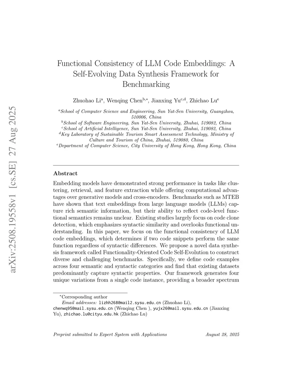 Functional Consistency of LLM Code Embeddings: A Self-Evolving Data Synthesis Framework for Benchmarking