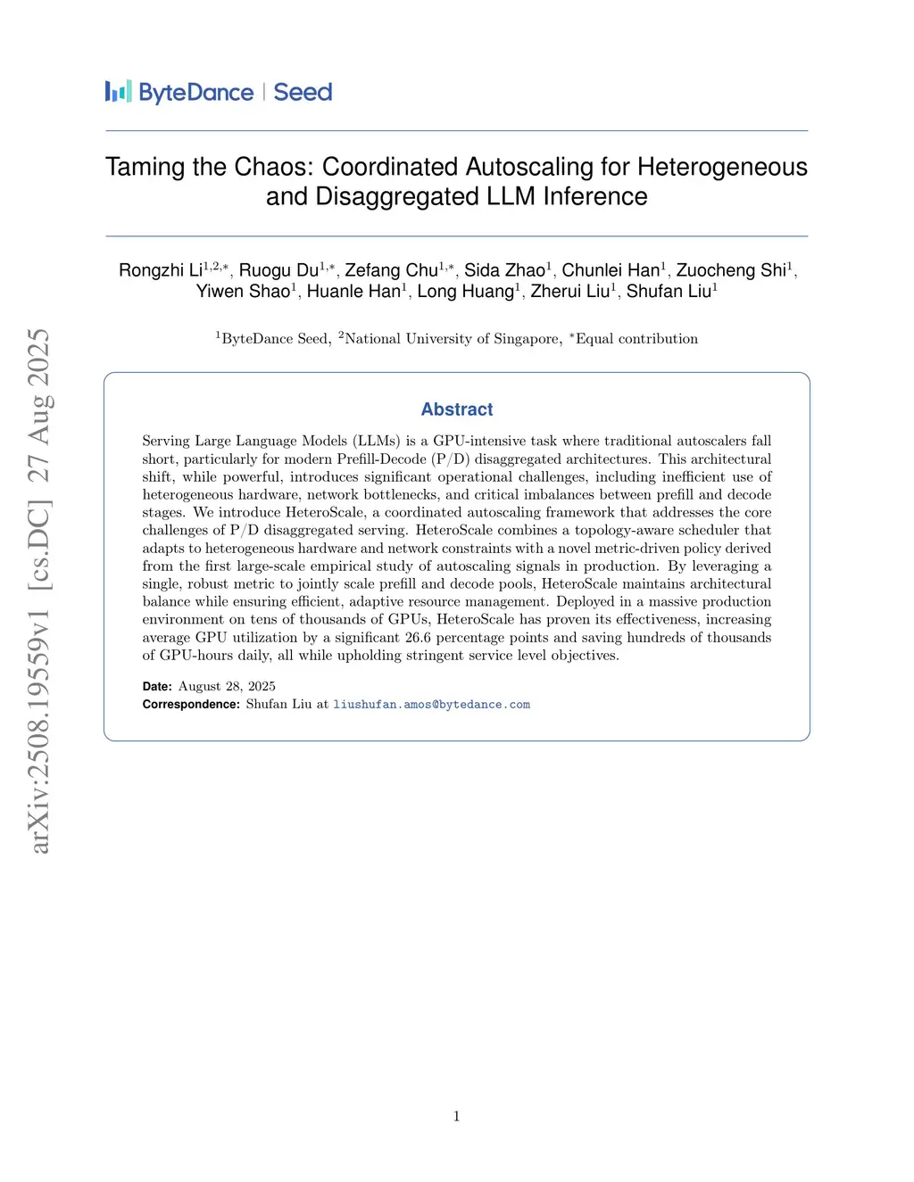 Serving Large Language Models (LLMs) is a GPU-intensive task where traditional autoscalers fall short, particularly for modern Prefill-Decode (P/D) disaggregated architectures. This architectural shift, while powerful, introduces significant operational challenges, including inefficient use of heterogeneous hardware, network bottlenecks, and critical imbalances between prefill and decode stages. We introduce HeteroScale, a coordinated autoscaling framework that addresses the core challenges of P/D disaggregated serving. HeteroScale combines a topology-aware scheduler that adapts to heterogeneous hardware and network constraints with a novel metric-driven policy derived from the first large-scale empirical study of autoscaling signals in production. By leveraging a single, robust metric to jointly scale prefill and decode pools, HeteroScale maintains architectural balance while ensuring efficient, adaptive resource management. Deployed in a massive production environment on tens of thousands of GPUs, HeteroScale has proven its effectiveness, increasing average GPU utilization by a significant 26.6 percentage points and saving hundreds of thousands of GPU-hours daily, all while upholding stringent service level objectives.