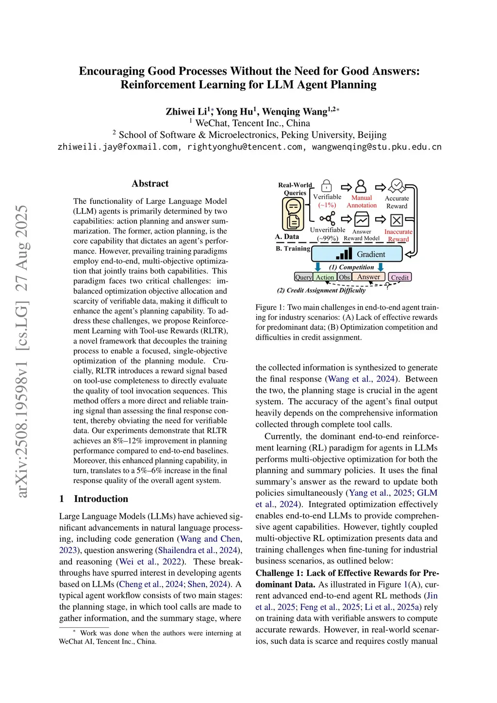 The functionality of Large Language Model (LLM) agents is primarily determined by two capabilities: action planning and answer summarization. The former, action planning, is the core capability that dictates an agent's performance. However, prevailing training paradigms employ end-to-end, multi-objective optimization that jointly trains both capabilities. This paradigm faces two critical challenges: imbalanced optimization objective allocation and scarcity of verifiable data, making it difficult to enhance the agent's planning capability. To address these challenges, we propose Reinforcement Learning with Tool-use Rewards (RLTR), a novel framework that decouples the training process to enable a focused, single-objective optimization of the planning module. Crucially, RLTR introduces a reward signal based on tool-use completeness to directly evaluate the quality of tool invocation sequences. This method offers a more direct and reliable training signal than assessing the final response content, thereby obviating the need for verifiable data. Our experiments demonstrate that RLTR achieves an 8%-12% improvement in planning performance compared to end-to-end baselines. Moreover, this enhanced planning capability, in turn, translates to a 5%-6% increase in the final response quality of the overall agent system.