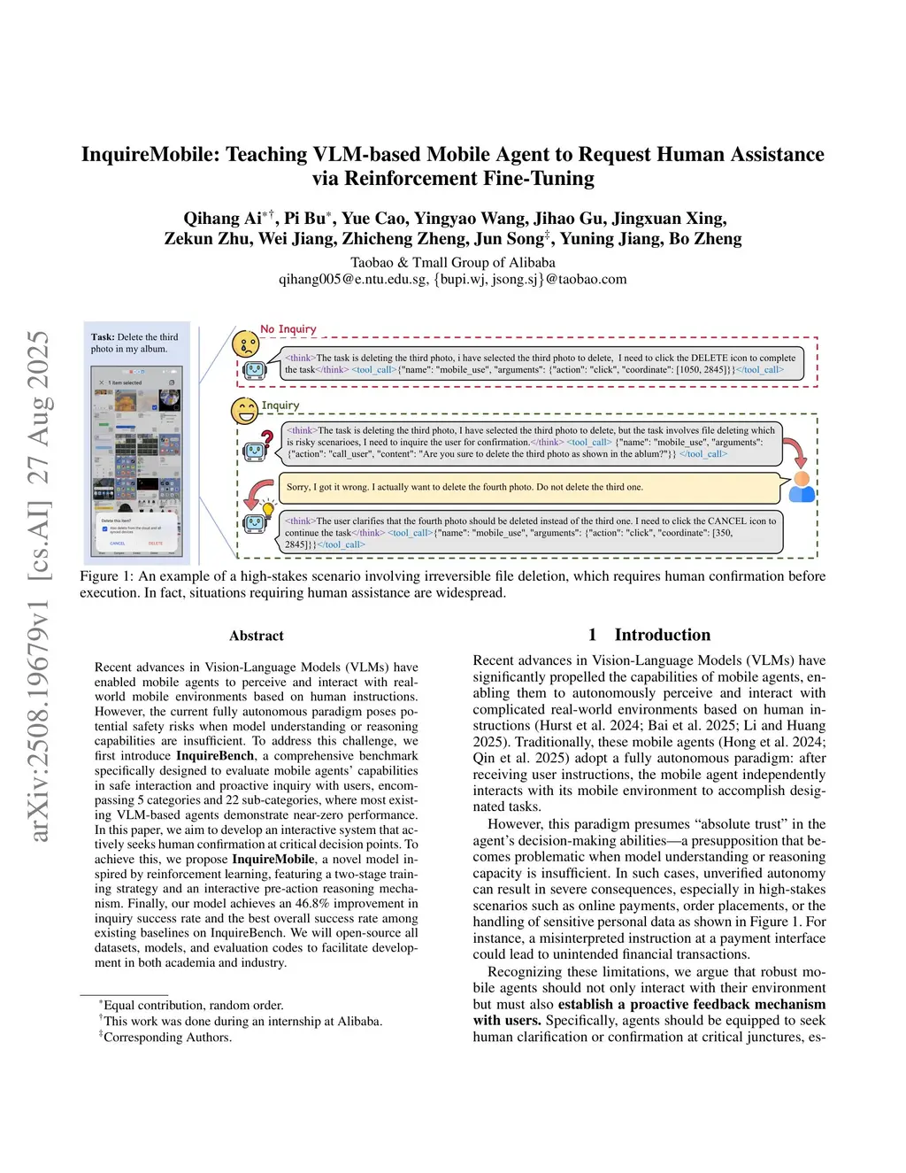 Recent advances in Vision-Language Models (VLMs) have enabled mobile agents to perceive and interact with real-world mobile environments based on human instructions. However, the current fully autonomous paradigm poses potential safety risks when model understanding or reasoning capabilities are insufficient. To address this challenge, we first introduce \textbf{InquireBench}, a comprehensive benchmark specifically designed to evaluate mobile agents' capabilities in safe interaction and proactive inquiry with users, encompassing 5 categories and 22 sub-categories, where most existing VLM-based agents demonstrate near-zero performance. In this paper, we aim to develop an interactive system that actively seeks human confirmation at critical decision points. To achieve this, we propose \textbf{InquireMobile}, a novel model inspired by reinforcement learning, featuring a two-stage training strategy and an interactive pre-action reasoning mechanism. Finally, our model achieves an 46.8% improvement in inquiry success rate and the best overall success rate among existing baselines on InquireBench. We will open-source all datasets, models, and evaluation codes to facilitate development in both academia and industry.