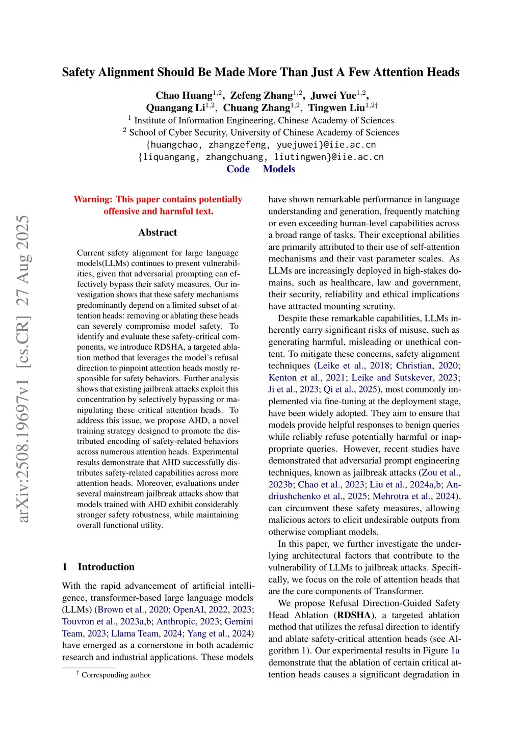 Current safety alignment for large language models(LLMs) continues to present vulnerabilities, given that adversarial prompting can effectively bypass their safetythis http URLinvestigation shows that these safety mechanisms predominantly depend on a limited subset of attention heads: removing or ablating these heads can severely compromise model safety. To identify and evaluate these safety-critical components, we introduce RDSHA, a targeted ablation method that leverages the model's refusal direction to pinpoint attention heads mostly responsible for safety behaviors. Further analysis shows that existing jailbreak attacks exploit this concentration by selectively bypassing or manipulating these critical attention heads. To address this issue, we propose AHD, a novel training strategy designed to promote the distributed encoding of safety-related behaviors across numerous attention heads. Experimental results demonstrate that AHD successfully distributes safety-related capabilities across more attention heads. Moreover, evaluations under several mainstream jailbreak attacks show that models trained with AHD exhibit considerably stronger safety robustness, while maintaining overall functional utility.