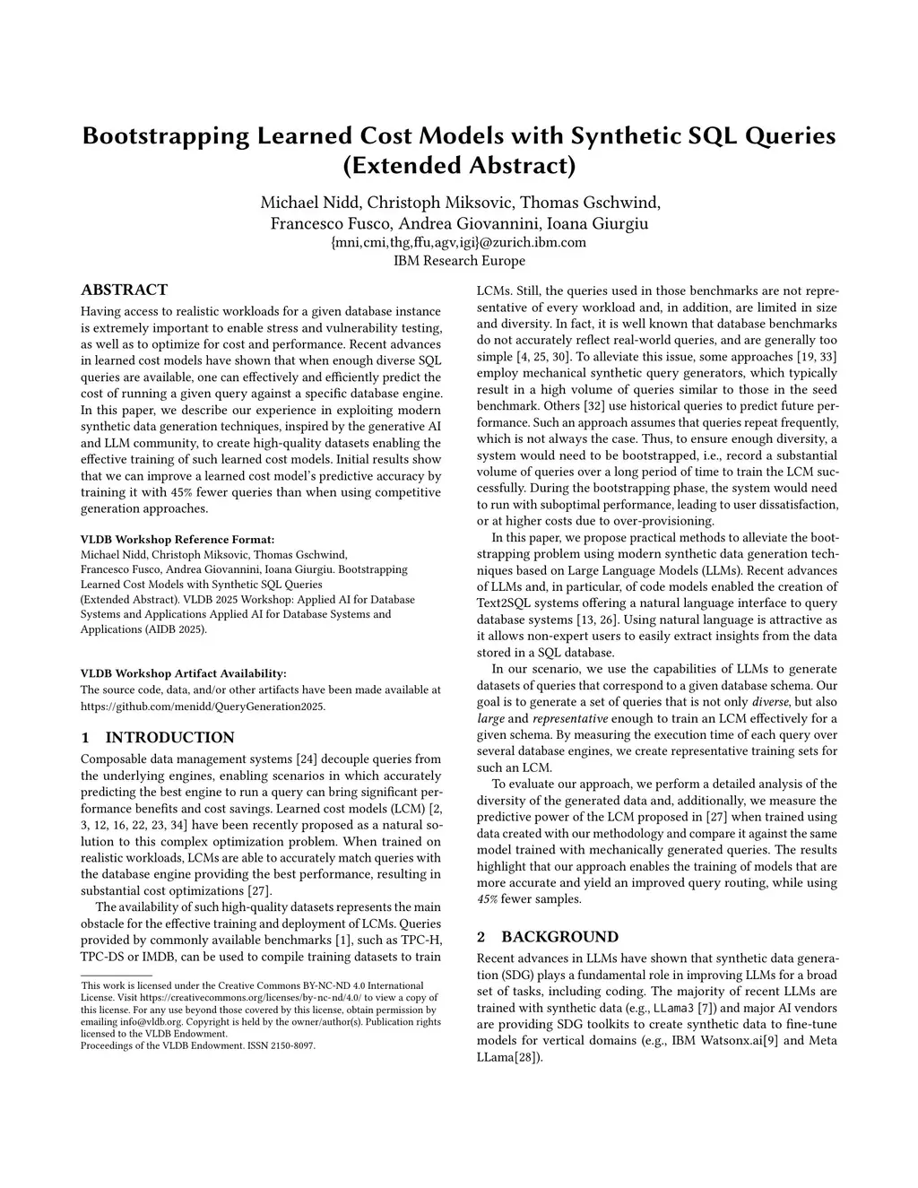 Having access to realistic workloads for a given database instance is extremely important to enable stress and vulnerability testing, as well as to optimize for cost and performance. Recent advances in learned cost models have shown that when enough diverse SQL queries are available, one can effectively and efficiently predict the cost of running a given query against a specific database engine. In this paper, we describe our experience in exploiting modern synthetic data generation techniques, inspired by the generative AI and LLM community, to create high-quality datasets enabling the effective training of such learned cost models. Initial results show that we can improve a learned cost model's predictive accuracy by training it with 45% fewer queries than when using competitive generation approaches.