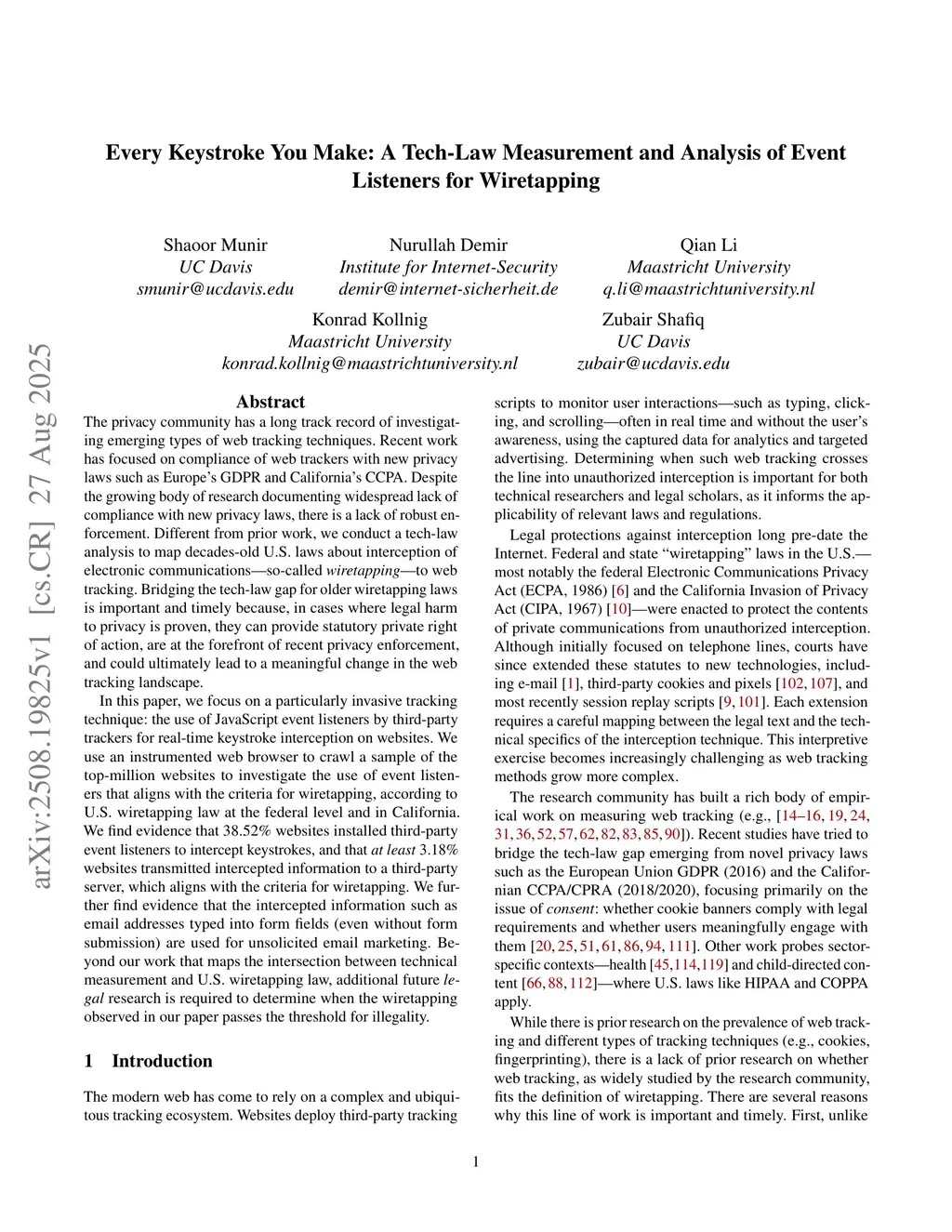 Every Keystroke You Make: A Tech-Law Measurement and Analysis of Event Listeners for Wiretapping
