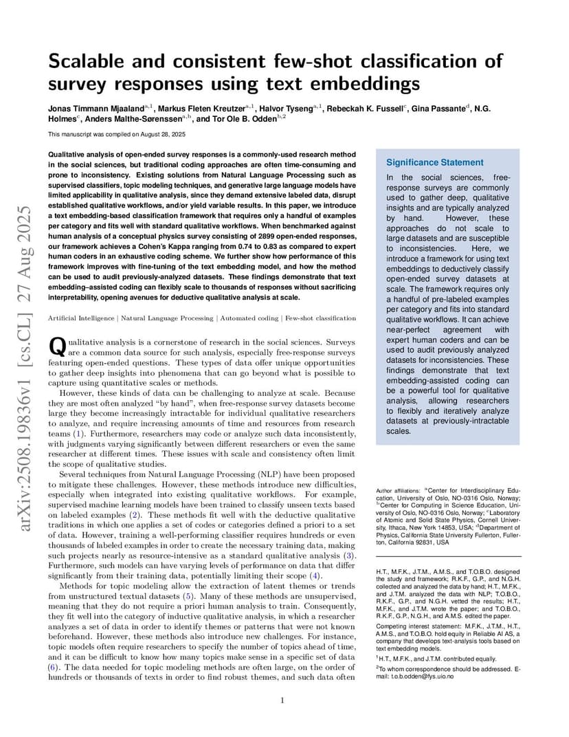 Scalable and consistent few-shot classification of survey responses using text embeddings