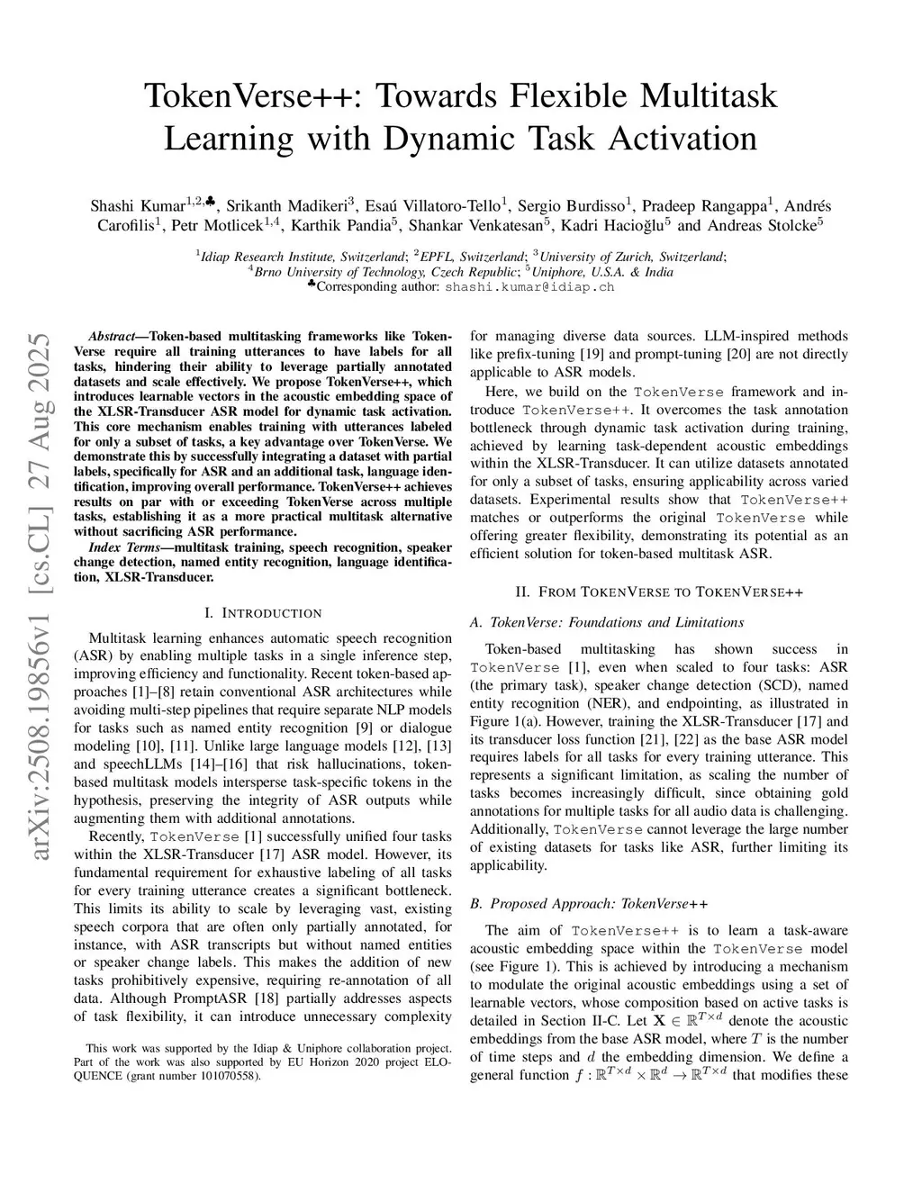 Token-based multitasking frameworks like TokenVerse require all training utterances to have labels for all tasks, hindering their ability to leverage partially annotated datasets and scale effectively. We propose TokenVerse++, which introduces learnable vectors in the acoustic embedding space of the XLSR-Transducer ASR model for dynamic task activation. This core mechanism enables training with utterances labeled for only a subset of tasks, a key advantage over TokenVerse. We demonstrate this by successfully integrating a dataset with partial labels, specifically for ASR and an additional task, language identification, improving overall performance. TokenVerse++ achieves results on par with or exceeding TokenVerse across multiple tasks, establishing it as a more practical multitask alternative without sacrificing ASR performance.