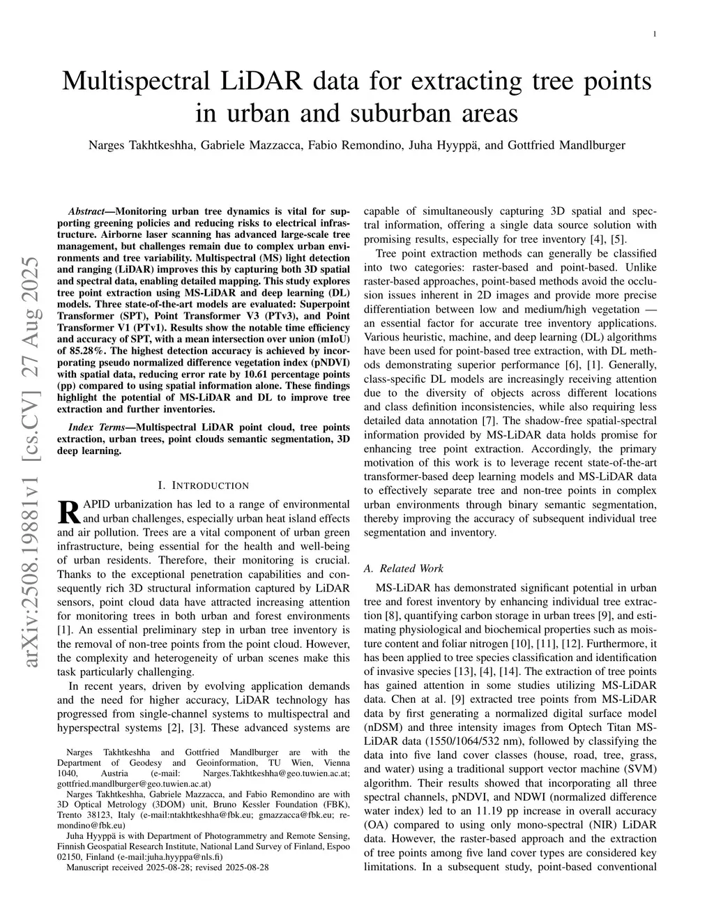 Multispectral LiDAR data for extracting tree points in urban and suburban areas