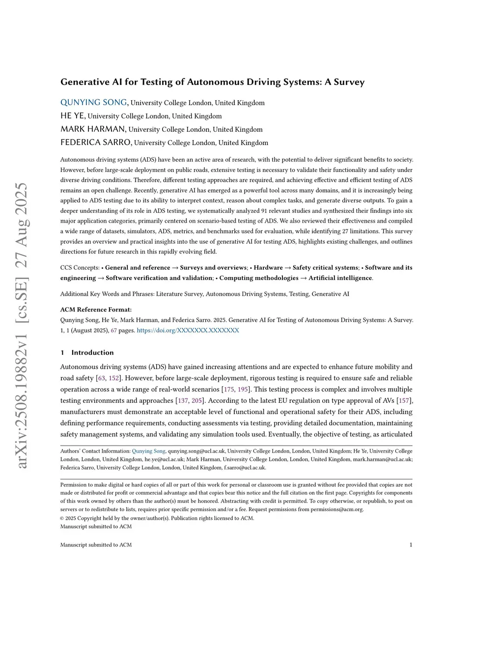 Generative AI for Testing of Autonomous Driving Systems: A Survey