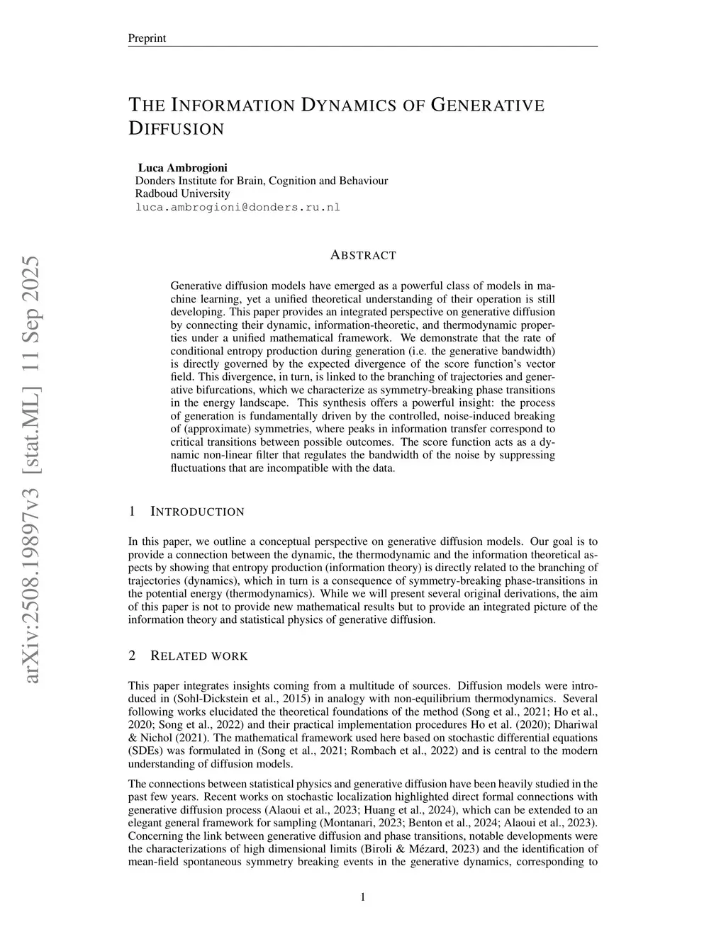 Generative diffusion models have emerged as a powerful class of models in machine learning, yet a unified theoretical understanding of their operation is still developing. This perspective paper provides an integrated perspective on generative diffusion by connecting their dynamic, information-theoretic, and thermodynamic properties under a unified mathematical framework. We demonstrate that the rate of conditional entropy production during generation (i.e. the generative bandwidth) is directly governed by the expected divergence of the score function's vector field. This divergence, in turn, is linked to the branching of trajectories and generative bifurcations, which we characterize as symmetry-breaking phase transitions in the energy landscape. This synthesis offers a powerful insight: the process of generation is fundamentally driven by the controlled, noise-induced breaking of (approximate) symmetries, where peaks in information transfer correspond to critical transitions between possible outcomes. The score function acts as a dynamic non-linear filter that regulates the bandwidth of the noise by suppressing fluctuations that are incompatible with the data.