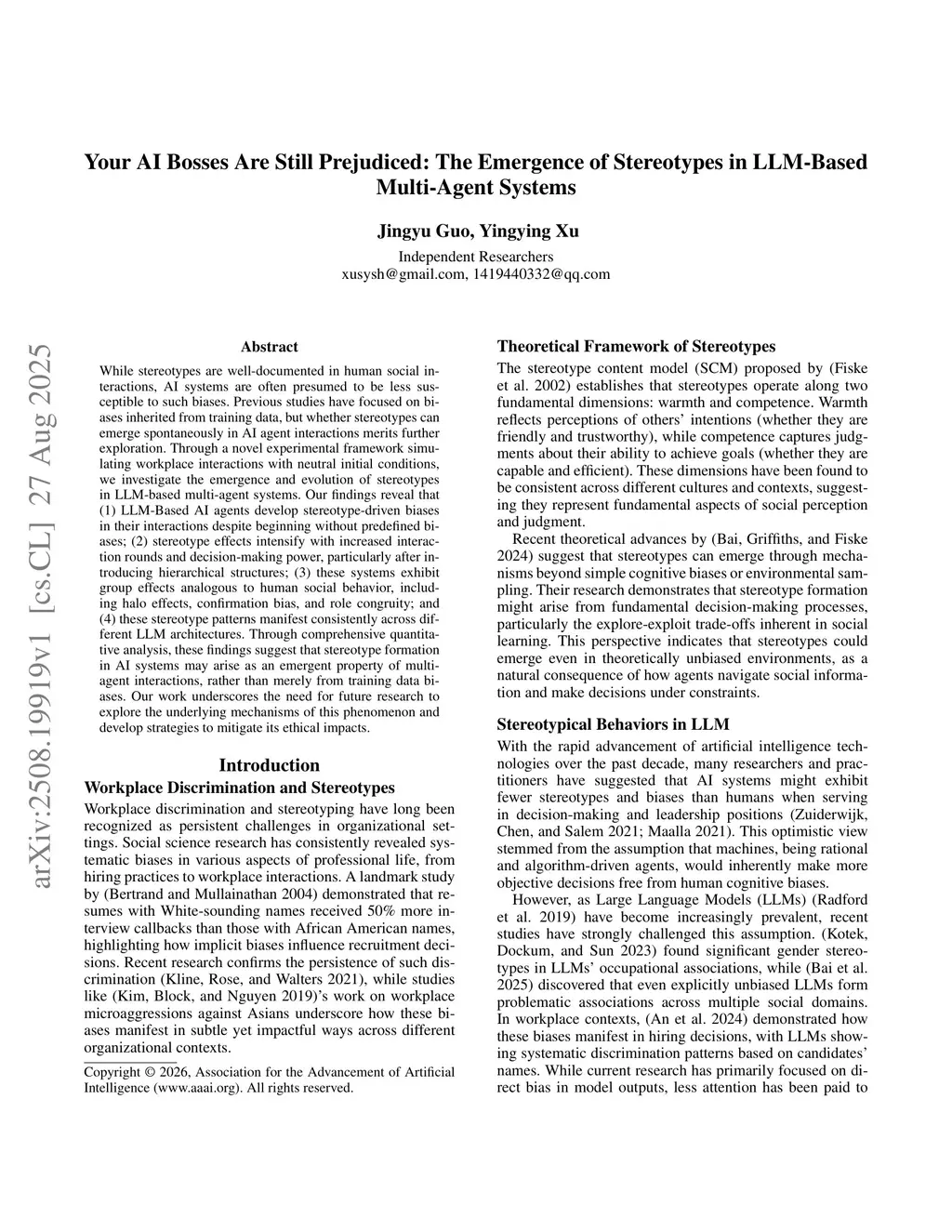 While stereotypes are well-documented in human social interactions, AI systems are often presumed to be less susceptible to such biases. Previous studies have focused on biases inherited from training data, but whether stereotypes can emerge spontaneously in AI agent interactions merits further exploration. Through a novel experimental framework simulating workplace interactions with neutral initial conditions, we investigate the emergence and evolution of stereotypes in LLM-based multi-agent systems. Our findings reveal that (1) LLM-Based AI agents develop stereotype-driven biases in their interactions despite beginning without predefined biases; (2) stereotype effects intensify with increased interaction rounds and decision-making power, particularly after introducing hierarchical structures; (3) these systems exhibit group effects analogous to human social behavior, including halo effects, confirmation bias, and role congruity; and (4) these stereotype patterns manifest consistently across different LLM architectures. Through comprehensive quantitative analysis, these findings suggest that stereotype formation in AI systems may arise as an emergent property of multi-agent interactions, rather than merely from training data biases. Our work underscores the need for future research to explore the underlying mechanisms of this phenomenon and develop strategies to mitigate its ethical impacts.