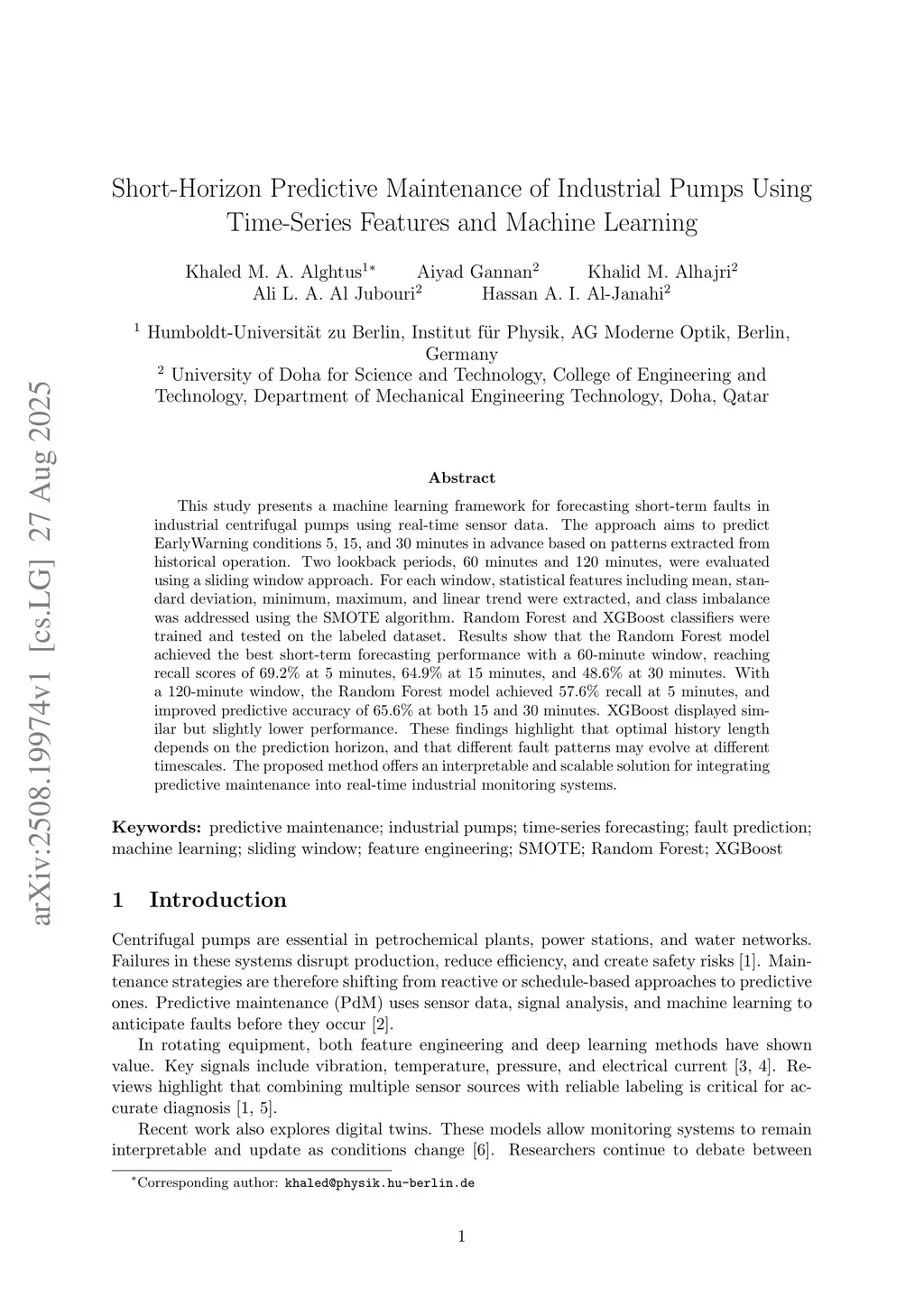 This study presents a machine learning framework for forecasting short-term faults in industrial centrifugal pumps using real-time sensor data. The approach aims to predict {EarlyWarning} conditions 5, 15, and 30 minutes in advance based on patterns extracted from historical operation. Two lookback periods, 60 minutes and 120 minutes, were evaluated using a sliding window approach. For each window, statistical features including mean, standard deviation, minimum, maximum, and linear trend were extracted, and class imbalance was addressed using the SMOTE algorithm. Random Forest and XGBoost classifiers were trained and tested on the labeled dataset. Results show that the Random Forest model achieved the best short-term forecasting performance with a 60-minute window, reaching recall scores of 69.2\% at 5 minutes, 64.9\% at 15 minutes, and 48.6\% at 30 minutes. With a 120-minute window, the Random Forest model achieved 57.6\% recall at 5 minutes, and improved predictive accuracy of 65.6\% at both 15 and 30 minutes. XGBoost displayed similar but slightly lower performance. These findings highlight that optimal history length depends on the prediction horizon, and that different fault patterns may evolve at different timescales. The proposed method offers an interpretable and scalable solution for integrating predictive maintenance into real-time industrial monitoring systems.