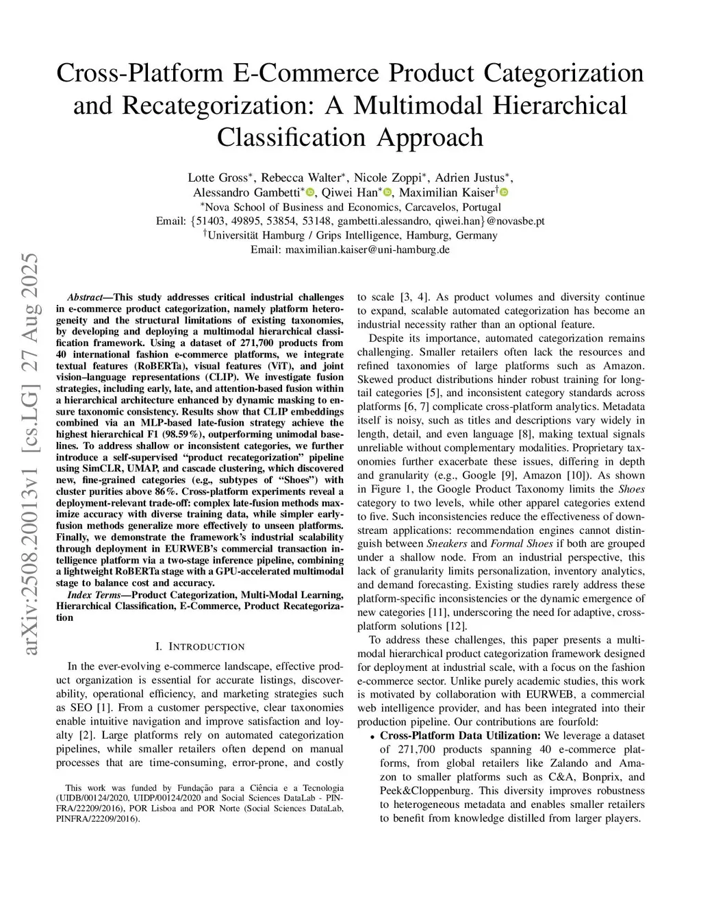 This study addresses critical industrial challenges in e-commerce product categorization, namely platform heterogeneity and the structural limitations of existing taxonomies, by developing and deploying a multimodal hierarchical classification framework. Using a dataset of 271,700 products from 40 international fashion e-commerce platforms, we integrate textual features (RoBERTa), visual features (ViT), and joint vision-language representations (CLIP). We investigate fusion strategies, including early, late, and attention-based fusion within a hierarchical architecture enhanced by dynamic masking to ensure taxonomic consistency. Results show that CLIP embeddings combined via an MLP-based late-fusion strategy achieve the highest hierarchical F1 (98.59%), outperforming unimodal baselines. To address shallow or inconsistent categories, we further introduce a self-supervised "product recategorization" pipeline using SimCLR, UMAP, and cascade clustering, which discovered new, fine-grained categories (for example, subtypes of "Shoes") with cluster purities above 86%. Cross-platform experiments reveal a deployment-relevant trade-off: complex late-fusion methods maximize accuracy with diverse training data, while simpler early-fusion methods generalize more effectively to unseen platforms. Finally, we demonstrate the framework's industrial scalability through deployment in EURWEB's commercial transaction intelligence platform via a two-stage inference pipeline, combining a lightweight RoBERTa stage with a GPU-accelerated multimodal stage to balance cost and accuracy.