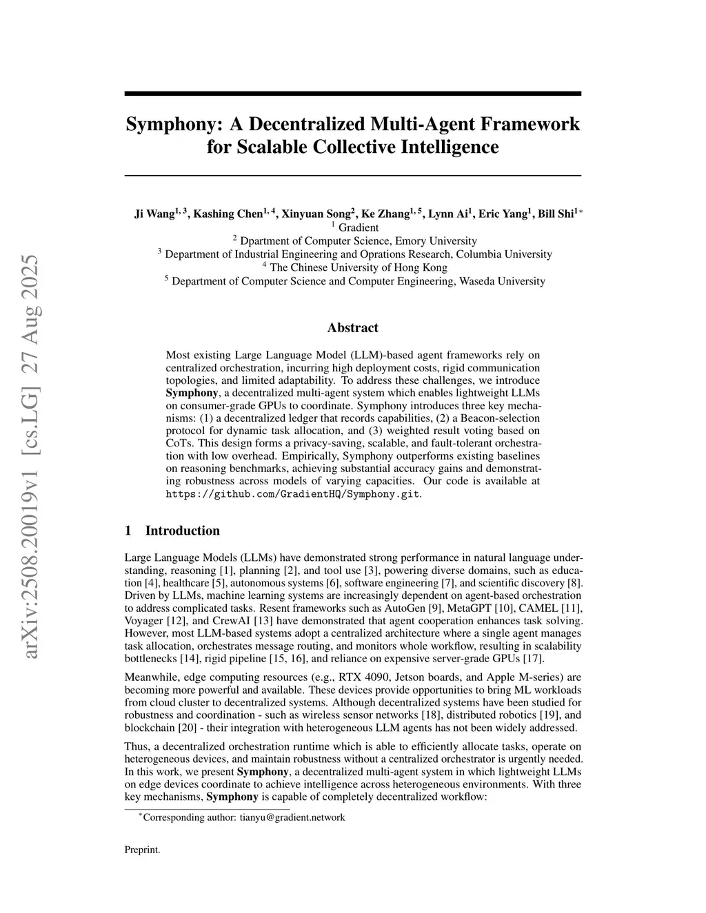 Most existing Large Language Model (LLM)-based agent frameworks rely on centralized orchestration, incurring high deployment costs, rigid communication topologies, and limited adaptability. To address these challenges, we introduce Symphony, a decentralized multi-agent system which enables lightweight LLMs on consumer-grade GPUs to coordinate. Symphony introduces three key mechanisms: (1) a decentralized ledger that records capabilities, (2) a Beacon-selection protocol for dynamic task allocation, and (3) weighted result voting based on CoTs. This design forms a privacy-saving, scalable, and fault-tolerant orchestration with low overhead. Empirically, Symphony outperforms existing baselines on reasoning benchmarks, achieving substantial accuracy gains and demonstrating robustness across models of varying capacities.