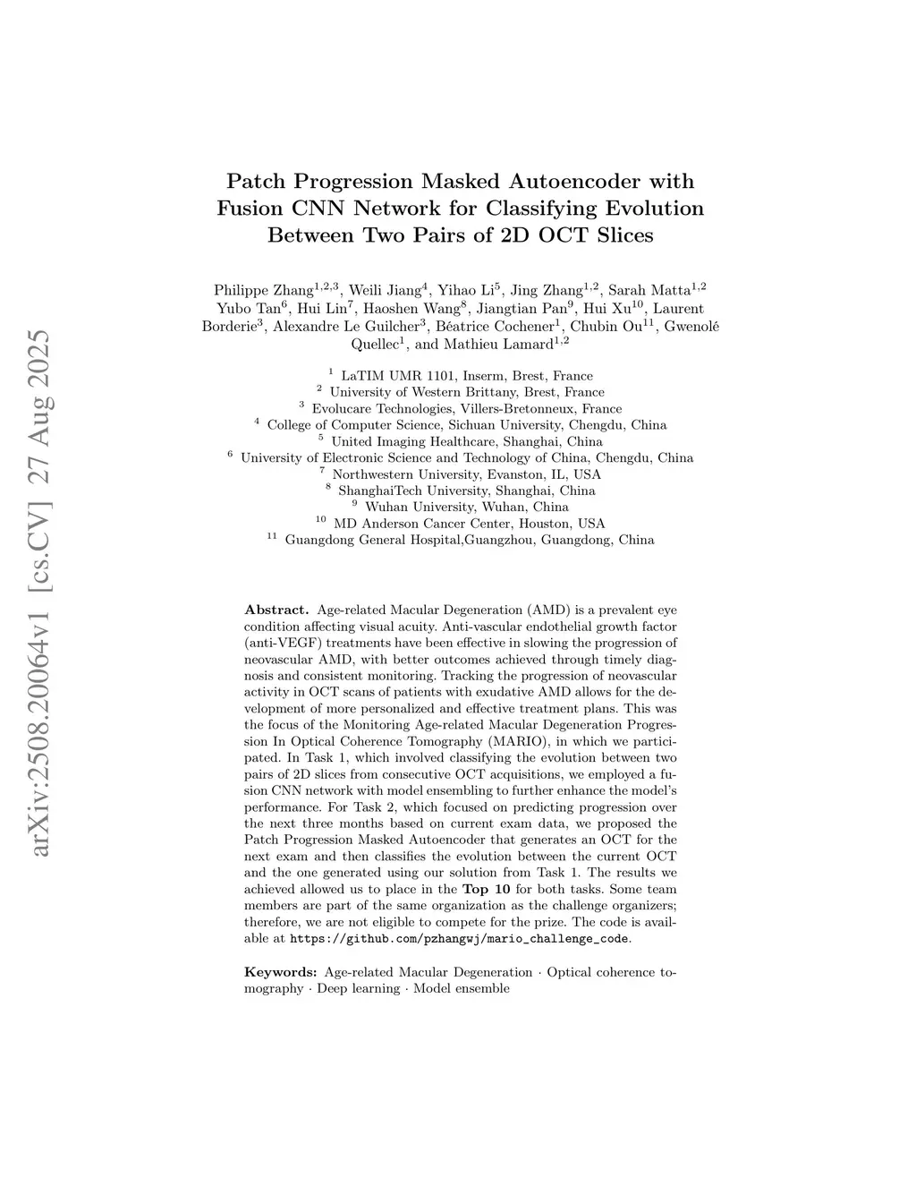 Age-related Macular Degeneration (AMD) is a prevalent eye condition affecting visual acuity. Anti-vascular endothelial growth factor (anti-VEGF) treatments have been effective in slowing the progression of neovascular AMD, with better outcomes achieved through timely diagnosis and consistent monitoring. Tracking the progression of neovascular activity in OCT scans of patients with exudative AMD allows for the development of more personalized and effective treatment plans. This was the focus of the Monitoring Age-related Macular Degeneration Progression in Optical Coherence Tomography (MARIO) challenge, in which we participated. In Task 1, which involved classifying the evolution between two pairs of 2D slices from consecutive OCT acquisitions, we employed a fusion CNN network with model ensembling to further enhance the model's performance. For Task 2, which focused on predicting progression over the next three months based on current exam data, we proposed the Patch Progression Masked Autoencoder that generates an OCT for the next exam and then classifies the evolution between the current OCT and the one generated using our solution from Task 1. The results we achieved allowed us to place in the Top 10 for both tasks. Some team members are part of the same organization as the challenge organizers; therefore, we are not eligible to compete for the prize.