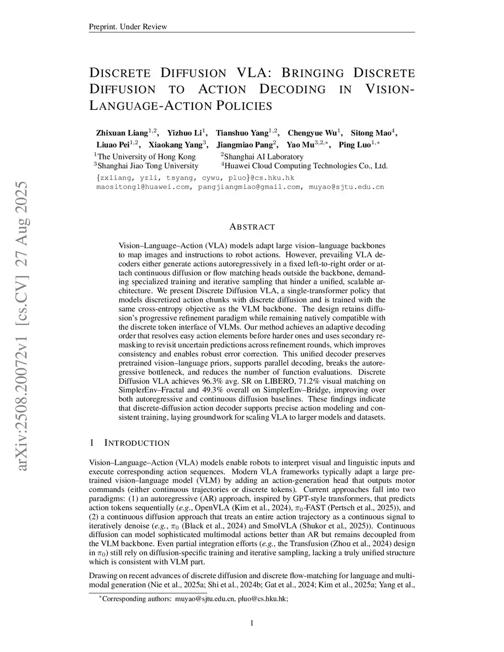 Vision-Language-Action (VLA) models adapt large vision-language backbones to map images and instructions into robot actions. However, prevailing VLAs either generate actions auto-regressively in a fixed left-to-right order or attach separate MLP or diffusion heads outside the backbone, leading to fragmented information pathways and specialized training requirements that hinder a unified, scalable architecture. We present Discrete Diffusion VLA, a unified-transformer policy that models discretized action chunks with discrete diffusion. The design retains diffusion's progressive refinement paradigm while remaining natively compatible with the discrete token interface of VLMs. Our method achieves an adaptive decoding order that resolves easy action elements before harder ones and uses secondary re-masking to revisit uncertain predictions across refinement rounds, which improves consistency and enables robust error correction. This unified decoder preserves pre-trained vision-language priors, supports parallel decoding, breaks the autoregressive bottleneck, and reduces the number of function evaluations. Discrete Diffusion VLA achieves 96.3% avg. success rates on LIBERO, 71.2% visual matching on SimplerEnv-Fractal and 54.2% overall on SimplerEnv-Bridge. We also provide ablation study on vision-language ability retention on LIBERO-OOD (Out-of-Distribution) benchmark, with our method improving over autoregressive, MLP decoder and continuous diffusion baselines. These findings indicate that discrete-diffusion VLA supports precise action modeling and consistent training, laying groundwork for scaling VLA to larger models and datasets. Our code is available atthis https URL.