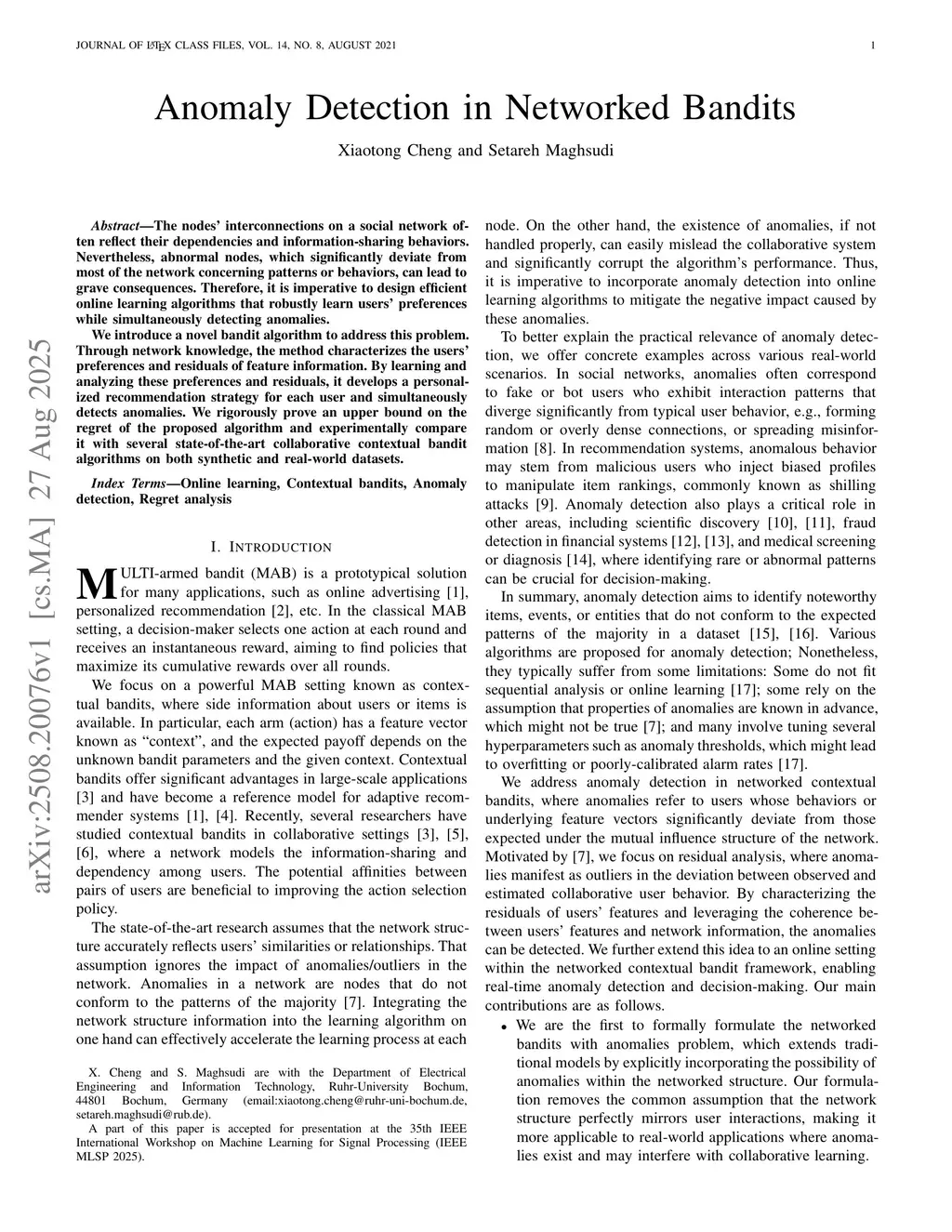 The nodes' interconnections on a social network often reflect their dependencies and information-sharing behaviors. Nevertheless, abnormal nodes, which significantly deviate from most of the network concerning patterns or behaviors, can lead to grave consequences. Therefore, it is imperative to design efficient online learning algorithms that robustly learn users' preferences while simultaneously detecting anomalies.We introduce a novel bandit algorithm to address this problem. Through network knowledge, the method characterizes the users' preferences and residuals of feature information. By learning and analyzing these preferences and residuals, it develops a personalized recommendation strategy for each user and simultaneously detects anomalies. We rigorously prove an upper bound on the regret of the proposed algorithm and experimentally compare it with several state-of-the-art collaborative contextual bandit algorithms on both synthetic and real-world datasets.