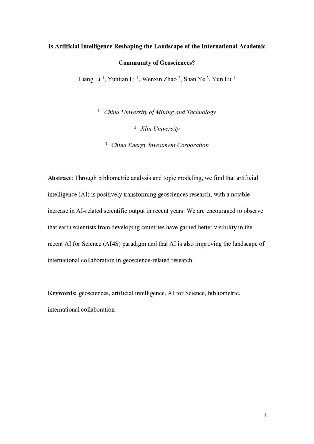 Is Artificial Intelligence Reshaping the Landscape of the International Academic Community of Geosciences?