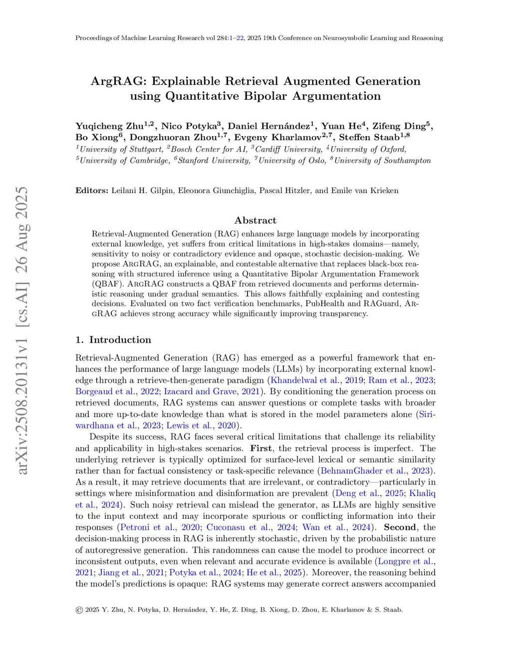 Retrieval-Augmented Generation (RAG) enhances large language models by incorporating external knowledge, yet suffers from critical limitations in high-stakes domains -- namely, sensitivity to noisy or contradictory evidence and opaque, stochastic decision-making. We propose ArgRAG, an explainable, and contestable alternative that replaces black-box reasoning with structured inference using a Quantitative Bipolar Argumentation Framework (QBAF). ArgRAG constructs a QBAF from retrieved documents and performs deterministic reasoning under gradual semantics. This allows faithfully explaining and contesting decisions. Evaluated on two fact verification benchmarks, PubHealth and RAGuard, ArgRAG achieves strong accuracy while significantly improving transparency.