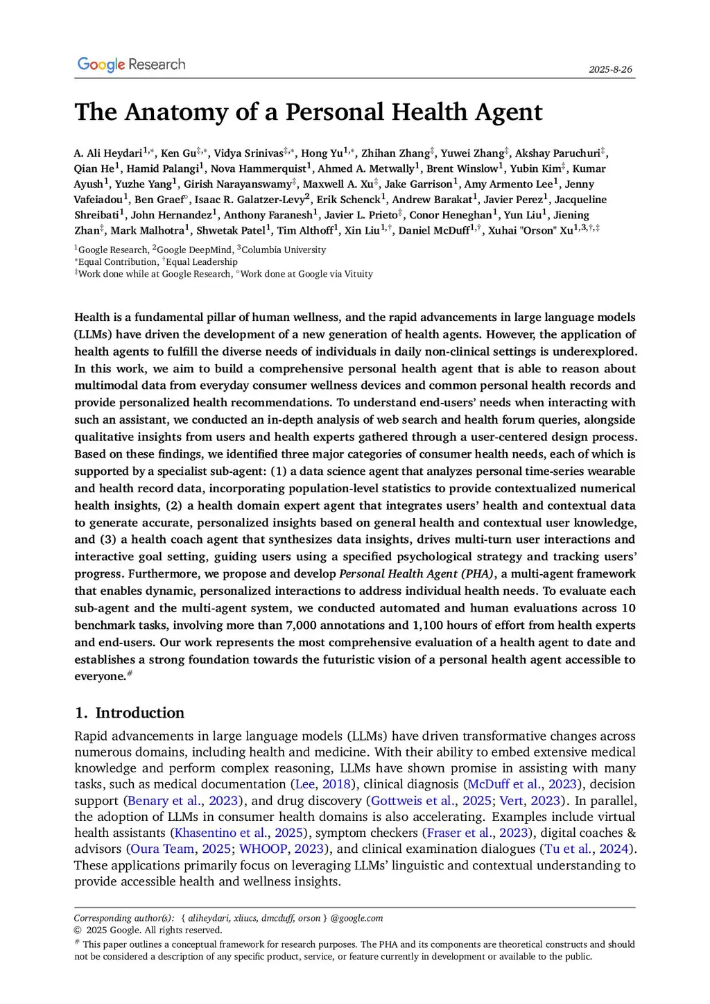 Health is a fundamental pillar of human wellness, and the rapid advancements in large language models (LLMs) have driven the development of a new generation of health agents. However, the application of health agents to fulfill the diverse needs of individuals in daily non-clinical settings is underexplored. In this work, we aim to build a comprehensive personal health agent that is able to reason about multimodal data from everyday consumer wellness devices and common personal health records, and provide personalized health recommendations. To understand end-users' needs when interacting with such an assistant, we conducted an in-depth analysis of web search and health forum queries, alongside qualitative insights from users and health experts gathered through a user-centered design process. Based on these findings, we identified three major categories of consumer health needs, each of which is supported by a specialist sub-agent: (1) a data science agent that analyzes personal time-series wearable and health record data, (2) a health domain expert agent that integrates users' health and contextual data to generate accurate, personalized insights, and (3) a health coach agent that synthesizes data insights, guiding users using a specified psychological strategy and tracking users' progress. Furthermore, we propose and develop the Personal Health Agent (PHA), a multi-agent framework that enables dynamic, personalized interactions to address individual health needs. To evaluate each sub-agent and the multi-agent system, we conducted automated and human evaluations across 10 benchmark tasks, involving more than 7,000 annotations and 1,100 hours of effort from health experts and end-users. Our work represents the most comprehensive evaluation of a health agent to date and establishes a strong foundation towards the futuristic vision of a personal health agent accessible to everyone.