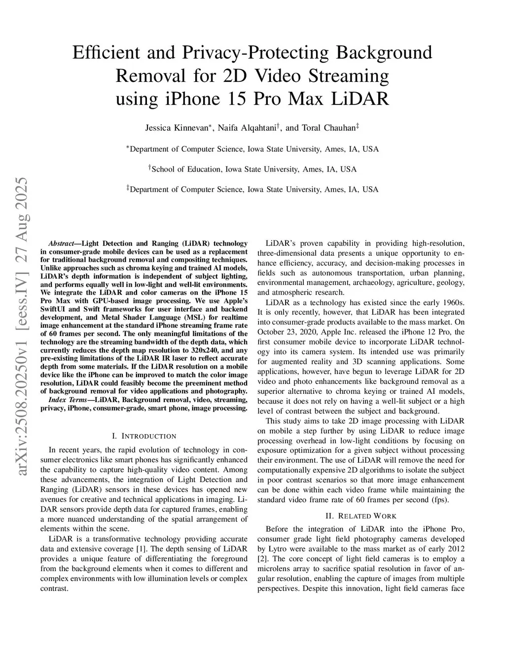 Efficient and Privacy-Protecting Background Removal for 2D Video Streaming using iPhone 15 Pro Max LiDAR