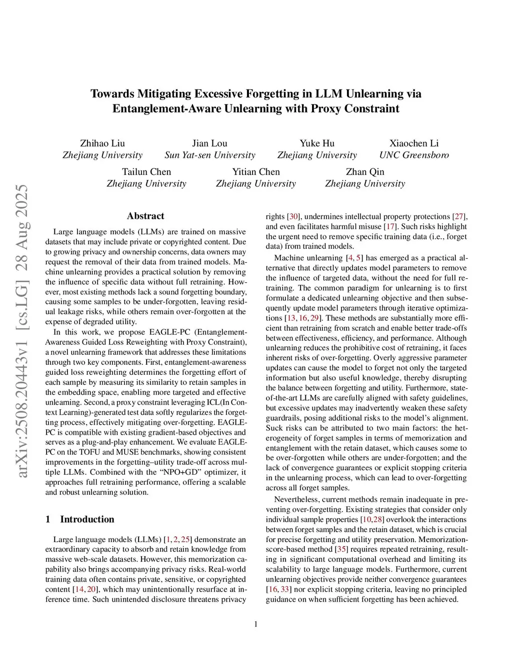 Large language models (LLMs) are trained on massive datasets that may include private or copyrighted content. Due to growing privacy and ownership concerns, data owners may request the removal of their data from trained models. Machine unlearning provides a practical solution by removing the influence of specific data without full retraining. However, most existing methods still suffer from over-unlearning due to the lack of a principled mechanism to regulate the forgetting boundary, leading to unnecessary utility degradation and heightened privacy and robustness risks. In this work, we propose EGUP (Entanglement-Guided Unlearning with Proxy Constraint), a novel framework that leverages entanglement and proxy constraint to guide the unlearning process while mitigating over-unlearning. Within each iteration, EGUP employs inter-sample entanglement to adaptively reweight the unlearning strength, assigning greater unlearning efforts to forget samples that are semantically closer to retained knowledge. Across iterations, EGUP leverages intra-sample entanglement to track the representation shift of each forget sample and dynamically adjust its unlearning effort. In addition, we incorporate a proxy constraint that approximates the model's expected outputs after unlearning, forming a reference boundary that softly regularizes the unlearning process. EGUP is compatible with existing gradient-based objectives and serves as a plug-and-play enhancement. We evaluate EGUP on the TOFU and MUSE benchmarks, demonstrating consistent improvements in the unlearning-utility trade-off across multiple LLMs. Moreover, EGUP achieves performance close to the retrained model while remaining scalable and robust.