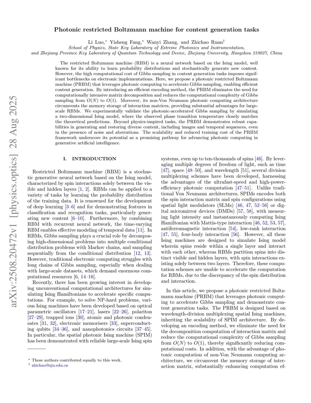 The restricted Boltzmann machine (RBM) is a neural network based on the Ising model, well known for its ability to learn probability distributions and stochastically generate new content. However, the high computational cost of Gibbs sampling in content generation tasks imposes significant bottlenecks on electronic implementations. Here, we propose a photonic restricted Boltzmann machine (PRBM) that leverages photonic computing to accelerate Gibbs sampling, enabling efficient content generation. By introducing an efficient encoding method, the PRBM eliminates the need for computationally intensive matrix decomposition and reduces the computational complexity of Gibbs sampling from to . Moreover, its non-Von Neumann photonic computing architecture circumvents the memory storage of interaction matrices, providing substantial advantages for large-scale RBMs. We experimentally validate the photonic-accelerated Gibbs sampling by simulating a two-dimensional Ising model, where the observed phase transition temperature closely matches the theoretical predictions. Beyond physics-inspired tasks, the PRBM demonstrates robust capabilities in generating and restoring diverse content, including images and temporal sequences, even in the presence of noise and aberrations. The scalability and reduced training cost of the PRBM framework underscore its potential as a promising pathway for advancing photonic computing in generative artificial intelligence.