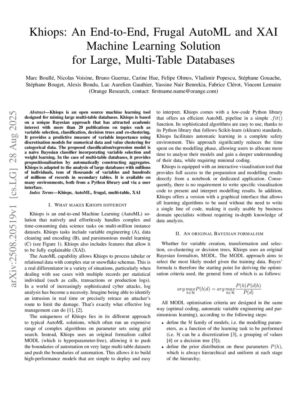 Khiops is an open source machine learning tool designed for mining large multi-table databases. Khiops is based on a unique Bayesian approach that has attracted academic interest with more than 20 publications on topics such as variable selection, classification, decision trees and co-clustering. It provides a predictive measure of variable importance using discretisation models for numerical data and value clustering for categorical data. The proposed classification/regression model is a naive Bayesian classifier incorporating variable selection and weight learning. In the case of multi-table databases, it provides propositionalisation by automatically constructing aggregates. Khiops is adapted to the analysis of large databases with millions of individuals, tens of thousands of variables and hundreds of millions of records in secondary tables. It is available on many environments, both from a Python library and via a user interface.