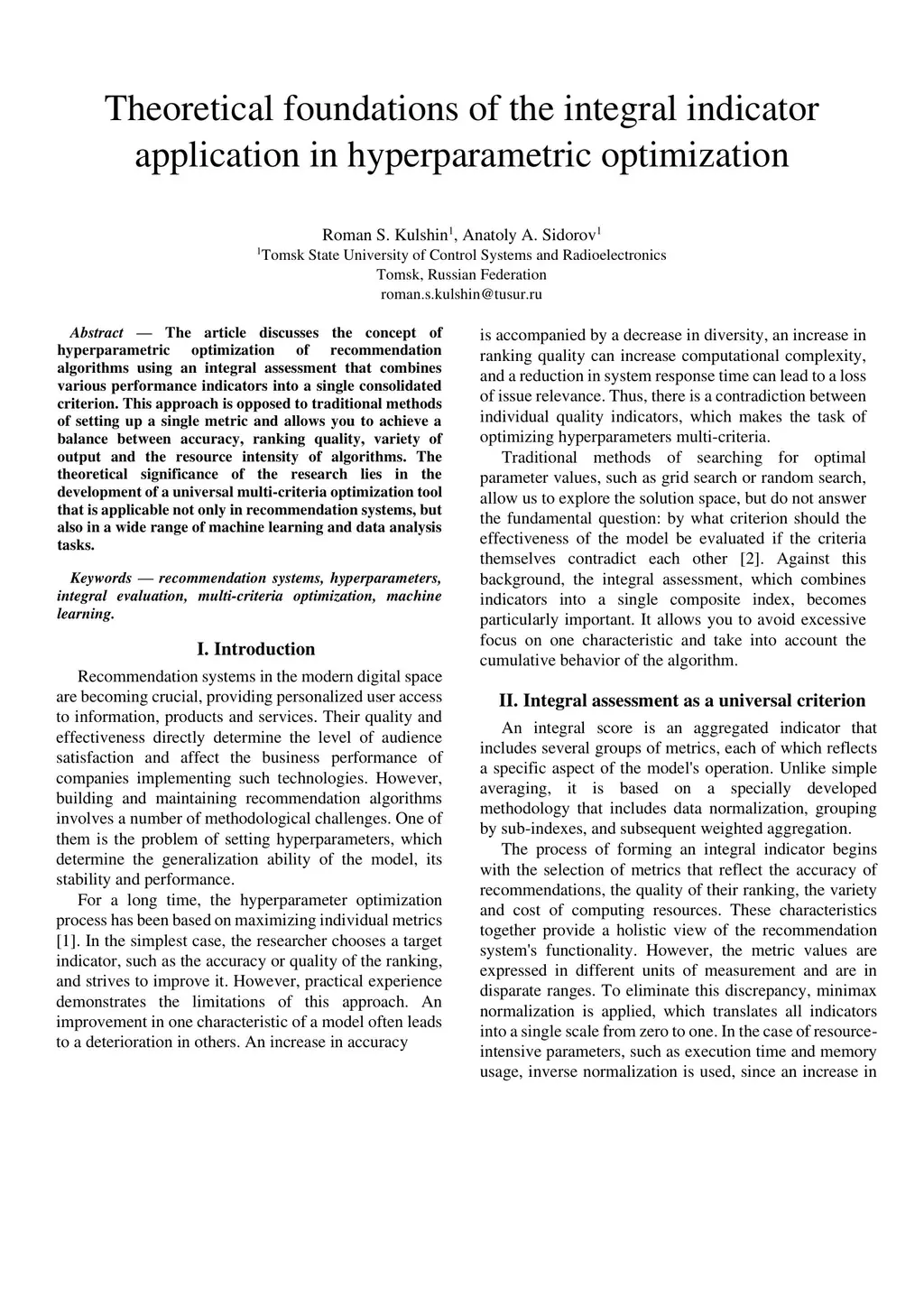 The article discusses the concept of hyperparametric optimization of recommendation algorithms using an integral assessment that combines various performance indicators into a single consolidated criterion. This approach is opposed to traditional methods of setting up a single metric and allows you to achieve a balance between accuracy, ranking quality, variety of output and the resource intensity of algorithms. The theoretical significance of the research lies in the development of a universal multi-criteria optimization tool that is applicable not only in recommendation systems, but also in a wide range of machine learning and data analysis tasks.