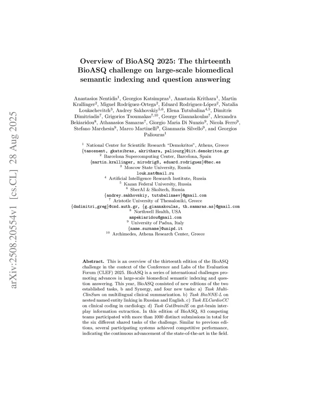 This is an overview of the thirteenth edition of the BioASQ challenge in the context of the Conference and Labs of the Evaluation Forum (CLEF) 2025. BioASQ is a series of international challenges promoting advances in large-scale biomedical semantic indexing and question answering. This year, BioASQ consisted of new editions of the two established tasks, b and Synergy, and four new tasks: a) Task MultiClinSum on multilingual clinical summarization. b) Task BioNNE-L on nested named entity linking in Russian and English. c) Task ELCardioCC on clinical coding in cardiology. d) Task GutBrainIE on gut-brain interplay information extraction. In this edition of BioASQ, 83 competing teams participated with more than 1000 distinct submissions in total for the six different shared tasks of the challenge. Similar to previous editions, several participating systems achieved competitive performance, indicating the continuous advancement of the state-of-the-art in the field.