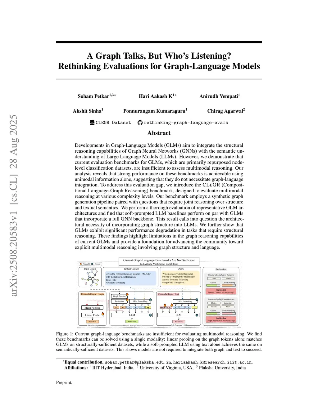 Developments in Graph-Language Models (GLMs) aim to integrate the structural reasoning capabilities of Graph Neural Networks (GNNs) with the semantic understanding of Large Language Models (LLMs). However, we demonstrate that current evaluation benchmarks for GLMs, which are primarily repurposed node-level classification datasets, are insufficient to assess multimodal reasoning. Our analysis reveals that strong performance on these benchmarks is achievable using unimodal information alone, suggesting that they do not necessitate graph-language integration. To address this evaluation gap, we introduce the CLEGR(Compositional Language-Graph Reasoning) benchmark, designed to evaluate multimodal reasoning at various complexity levels. Our benchmark employs a synthetic graph generation pipeline paired with questions that require joint reasoning over structure and textual semantics. We perform a thorough evaluation of representative GLM architectures and find that soft-prompted LLM baselines perform on par with GLMs that incorporate a full GNN backbone. This result calls into question the architectural necessity of incorporating graph structure into LLMs. We further show that GLMs exhibit significant performance degradation in tasks that require structural reasoning. These findings highlight limitations in the graph reasoning capabilities of current GLMs and provide a foundation for advancing the community toward explicit multimodal reasoning involving graph structure and language.