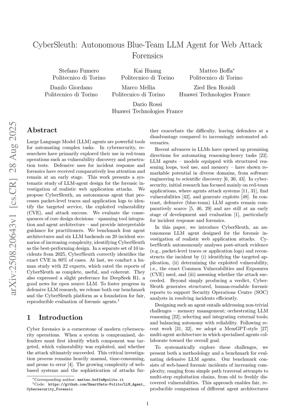 CyberSleuth: Autonomous Blue-Team LLM Agent for Web Attack Forensics