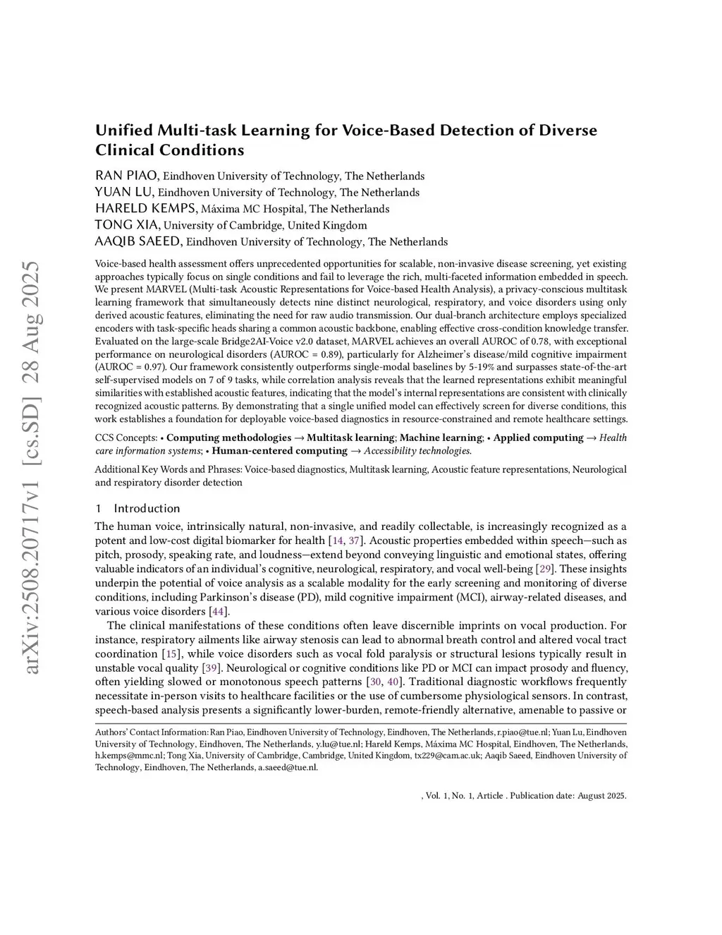 Voice-based health assessment offers unprecedented opportunities for scalable, non-invasive disease screening, yet existing approaches typically focus on single conditions and fail to leverage the rich, multi-faceted information embedded in speech. We present MARVEL (Multi-task Acoustic Representations for Voice-based Health Analysis), a privacy-conscious multitask learning framework that simultaneously detects nine distinct neurological, respiratory, and voice disorders using only derived acoustic features, eliminating the need for raw audio transmission. Our dual-branch architecture employs specialized encoders with task-specific heads sharing a common acoustic backbone, enabling effective cross-condition knowledge transfer. Evaluated on the large-scale Bridge2AI-Voice v2.0 dataset, MARVEL achieves an overall AUROC of 0.78, with exceptional performance on neurological disorders (AUROC = 0.89), particularly for Alzheimer's disease/mild cognitive impairment (AUROC = 0.97). Our framework consistently outperforms single-modal baselines by 5-19% and surpasses state-of-the-art self-supervised models on 7 of 9 tasks, while correlation analysis reveals that the learned representations exhibit meaningful similarities with established acoustic features, indicating that the model's internal representations are consistent with clinically recognized acoustic patterns. By demonstrating that a single unified model can effectively screen for diverse conditions, this work establishes a foundation for deployable voice-based diagnostics in resource-constrained and remote healthcare settings.