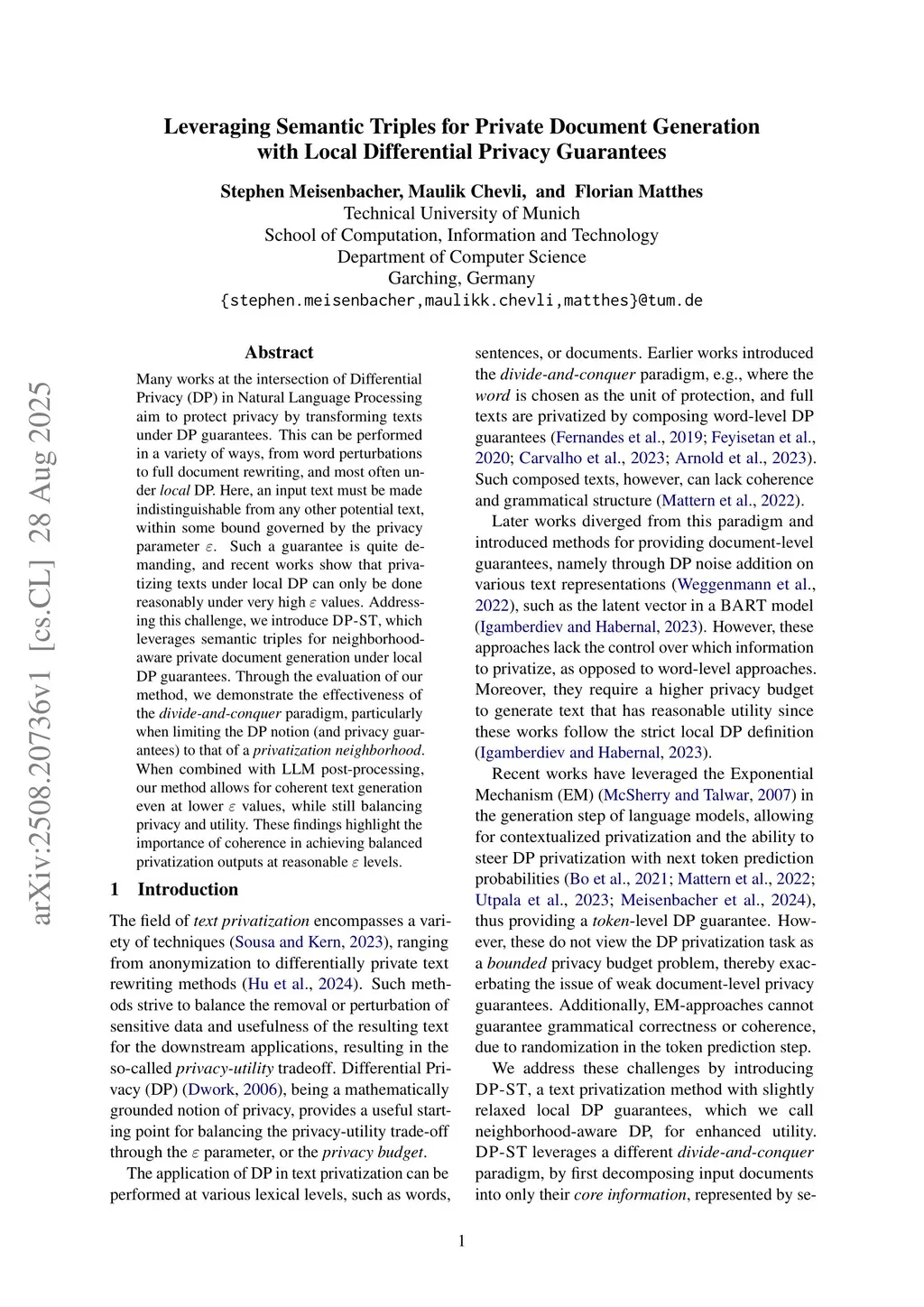 Many works at the intersection of Differential Privacy (DP) in Natural Language Processing aim to protect privacy by transforming texts under DP guarantees. This can be performed in a variety of ways, from word perturbations to full document rewriting, and most often under local DP. Here, an input text must be made indistinguishable from any other potential text, within some bound governed by the privacy parameter . Such a guarantee is quite demanding, and recent works show that privatizing texts under local DP can only be done reasonably under very high values. Addressing this challenge, we introduce DP-ST, which leverages semantic triples for neighborhood-aware private document generation under local DP guarantees. Through the evaluation of our method, we demonstrate the effectiveness of the divide-and-conquer paradigm, particularly when limiting the DP notion (and privacy guarantees) to that of a privatization neighborhood. When combined with LLM post-processing, our method allows for coherent text generation even at lower values, while still balancing privacy and utility. These findings highlight the importance of coherence in achieving balanced privatization outputs at reasonable levels.
