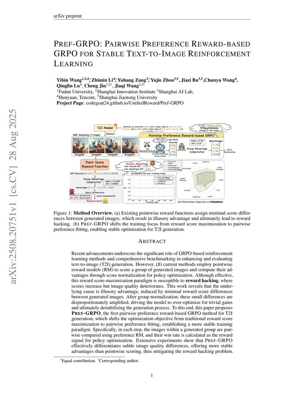 Recent advancements highlight the importance of GRPO-based reinforcement learning methods and benchmarking in enhancing text-to-image (T2I) generation. However, current methods using pointwise reward models (RM) for scoring generated images are susceptible to reward hacking. We reveal that this happens when minimal score differences between images are amplified after normalization, creating illusory advantages that drive the model to over-optimize for trivial gains, ultimately destabilizing the image generation process. To address this, we propose Pref-GRPO, a pairwise preference reward-based GRPO method that shifts the optimization objective from score maximization to preference fitting, ensuring more stable training. In Pref-GRPO, images are pairwise compared within each group using preference RM, and the win rate is used as the reward signal. Extensive experiments demonstrate that PREF-GRPO differentiates subtle image quality differences, providing more stable advantages and mitigating reward hacking. Additionally, existing T2I benchmarks are limited by coarse evaluation criteria, hindering comprehensive model assessment. To solve this, we introduce UniGenBench, a unified T2I benchmark comprising 600 prompts across 5 main themes and 20 subthemes. It evaluates semantic consistency through 10 primary and 27 sub-criteria, leveraging MLLM for benchmark construction and evaluation. Our benchmarks uncover the strengths and weaknesses of both open and closed-source T2I models and validate the effectiveness of Pref-GRPO.