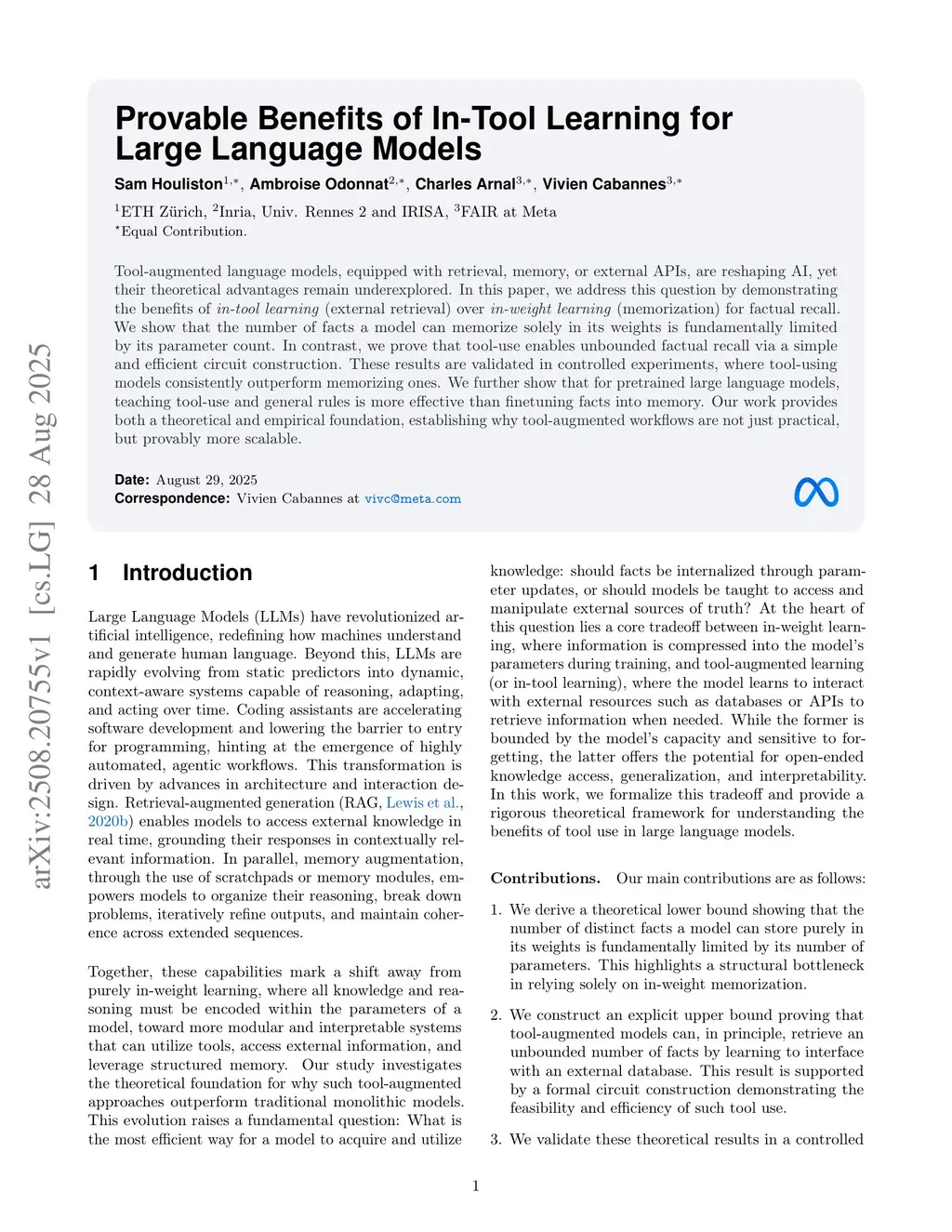 Tool-augmented language models, equipped with retrieval, memory, or external APIs, are reshaping AI, yet their theoretical advantages remain underexplored. In this paper, we address this question by demonstrating the benefits of in-tool learning (external retrieval) over in-weight learning (memorization) for factual recall. We show that the number of facts a model can memorize solely in its weights is fundamentally limited by its parameter count. In contrast, we prove that tool-use enables unbounded factual recall via a simple and efficient circuit construction. These results are validated in controlled experiments, where tool-using models consistently outperform memorizing ones. We further show that for pretrained large language models, teaching tool-use and general rules is more effective than finetuning facts into memory. Our work provides both a theoretical and empirical foundation, establishing why tool-augmented workflows are not just practical, but provably more scalable.