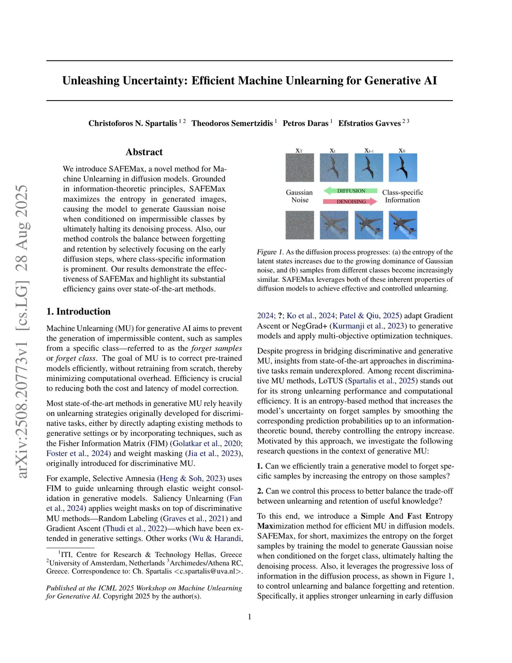 We introduce SAFEMax, a novel method for Machine Unlearning in diffusion models. Grounded in information-theoretic principles, SAFEMax maximizes the entropy in generated images, causing the model to generate Gaussian noise when conditioned on impermissible classes by ultimately halting its denoising process. Also, our method controls the balance between forgetting and retention by selectively focusing on the early diffusion steps, where class-specific information is prominent. Our results demonstrate the effectiveness of SAFEMax and highlight its substantial efficiency gains over state-of-the-art methods.