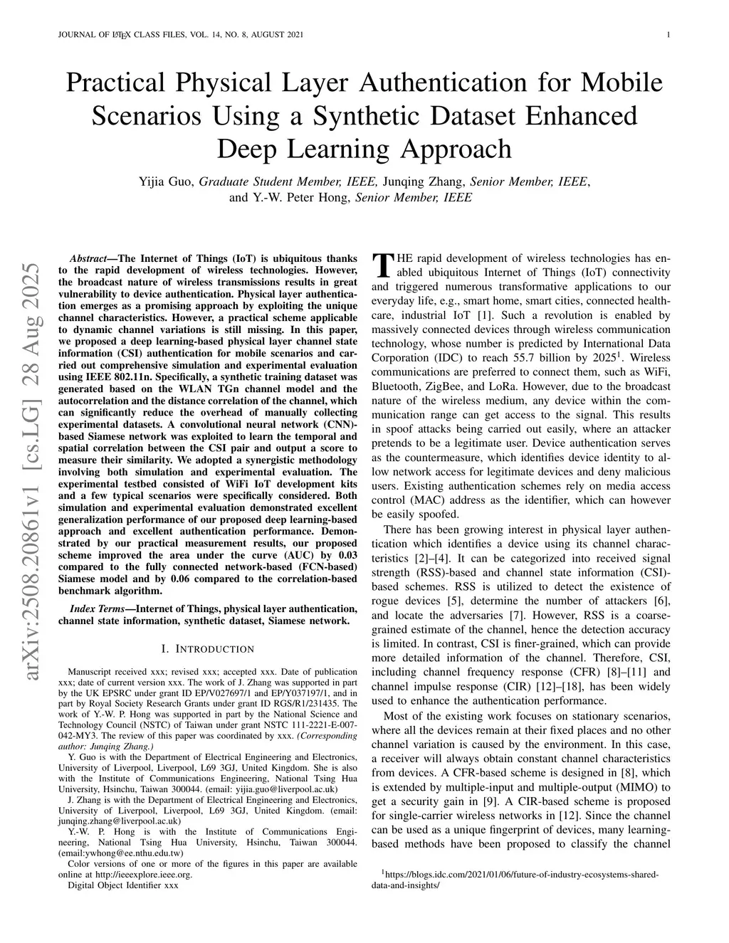 The Internet of Things (IoT) is ubiquitous thanks to the rapid development of wireless technologies. However, the broadcast nature of wireless transmissions results in great vulnerability to device authentication. Physical layer authentication emerges as a promising approach by exploiting the unique channel characteristics. However, a practical scheme applicable to dynamic channel variations is still missing. In this paper, we proposed a deep learning-based physical layer channel state information (CSI) authentication for mobile scenarios and carried out comprehensive simulation and experimental evaluation using IEEE 802.11n. Specifically, a synthetic training dataset was generated based on the WLAN TGn channel model and the autocorrelation and the distance correlation of the channel, which can significantly reduce the overhead of manually collecting experimental datasets. A convolutional neural network (CNN)-based Siamese network was exploited to learn the temporal and spatial correlation between the CSI pair and output a score to measure their similarity. We adopted a synergistic methodology involving both simulation and experimental evaluation. The experimental testbed consisted of WiFi IoT development kits and a few typical scenarios were specifically considered. Both simulation and experimental evaluation demonstrated excellent generalization performance of our proposed deep learning-based approach and excellent authentication performance. Demonstrated by our practical measurement results, our proposed scheme improved the area under the curve (AUC) by 0.03 compared to the fully connected network-based (FCN-based) Siamese model and by 0.06 compared to the correlation-based benchmark algorithm.