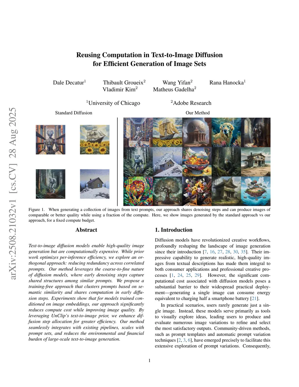 Text-to-image diffusion models enable high-quality image generation but are computationally expensive. While prior work optimizes per-inference efficiency, we explore an orthogonal approach: reducing redundancy across correlated prompts. Our method leverages the coarse-to-fine nature of diffusion models, where early denoising steps capture shared structures among similar prompts. We propose a training-free approach that clusters prompts based on semantic similarity and shares computation in early diffusion steps. Experiments show that for models trained conditioned on image embeddings, our approach significantly reduces compute cost while improving image quality. By leveraging UnClip's text-to-image prior, we enhance diffusion step allocation for greater efficiency. Our method seamlessly integrates with existing pipelines, scales with prompt sets, and reduces the environmental and financial burden of large-scale text-to-image generation. Project page:this https URL