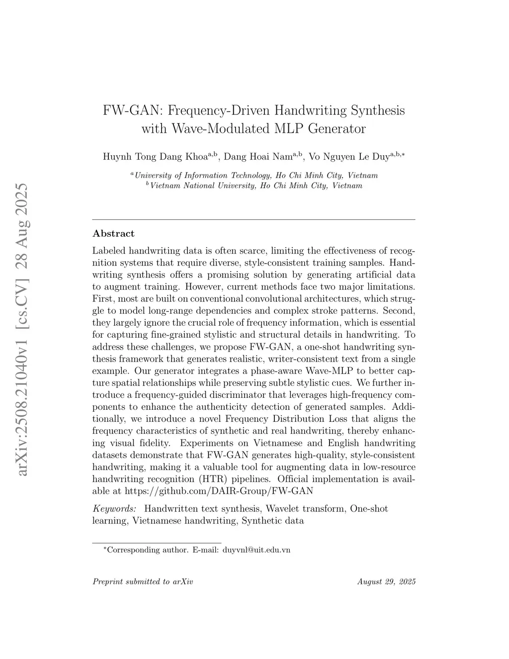 FW-GAN: Frequency-Driven Handwriting Synthesis with Wave-Modulated MLP Generator